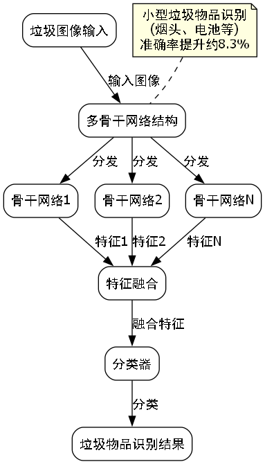 在实际应用中,我们发现多骨干网络结构在处理小型垃圾物品(如烟头、电池)时表现尤为突出,相比单一骨干网络,准确率提升了约8.3%。这得益于多网络融合后增强的特征表达能力,使得模型能够更好地识别尺寸差异较大的各类垃圾物品。