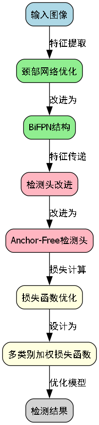 - 颈部网络优化:将原来的FPN结构改进为BiFPN,实现了更高效的特征融合;