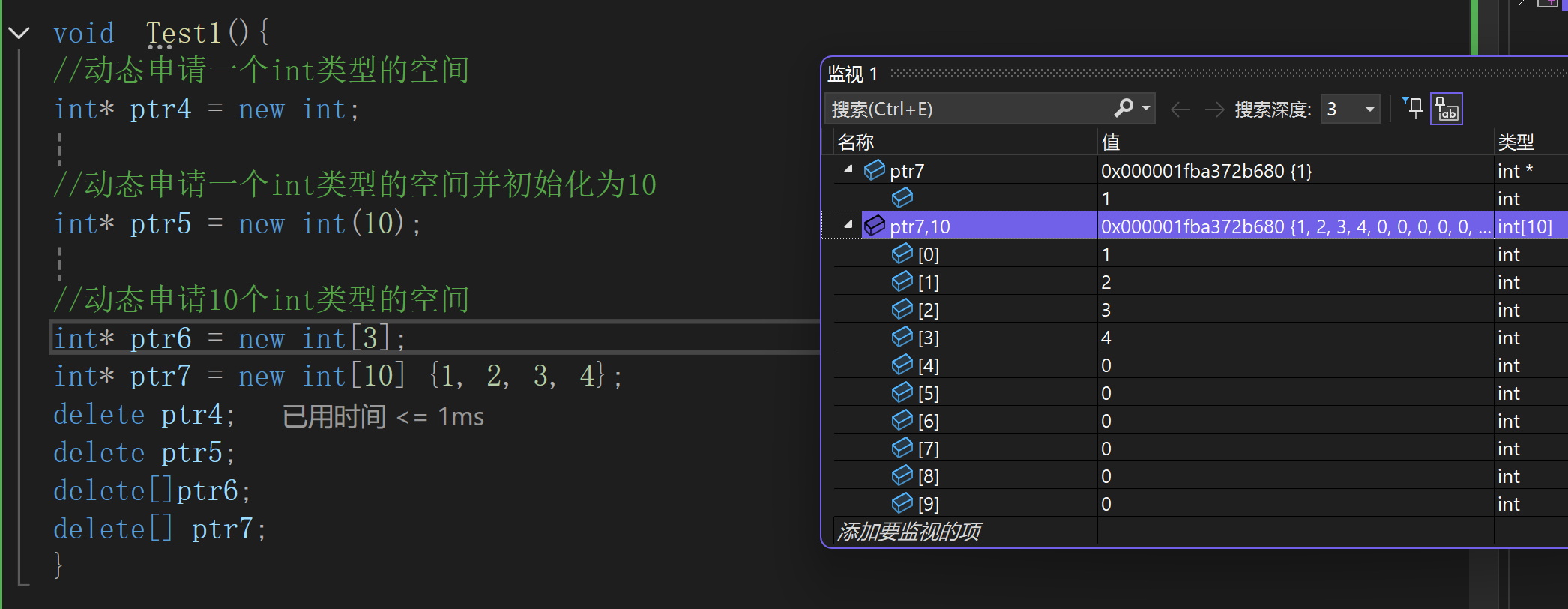 int* ptr7 = new int[10] {1, 2, 3, 4};