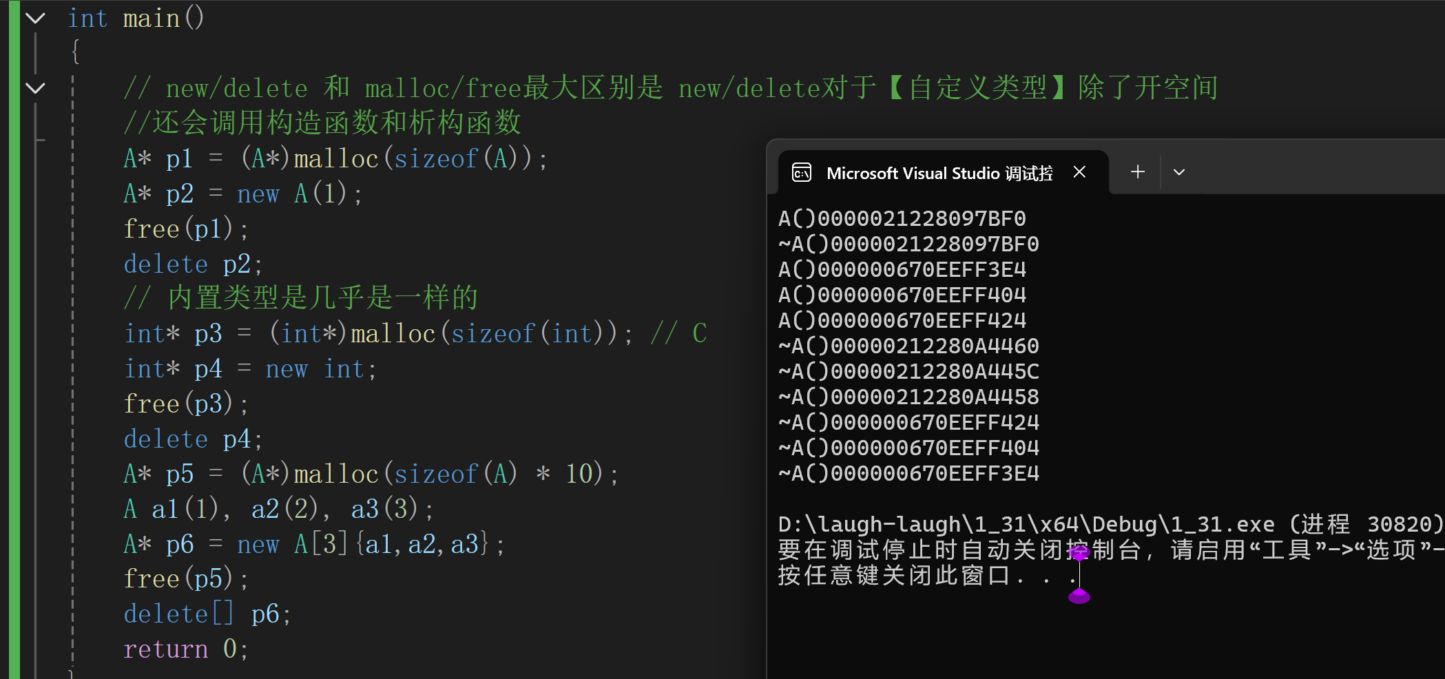 总结:申请和释放单个元素的空间,使用new和delete操作符,申请和释放连续的空间,使用new[ ]和delete[ ]
