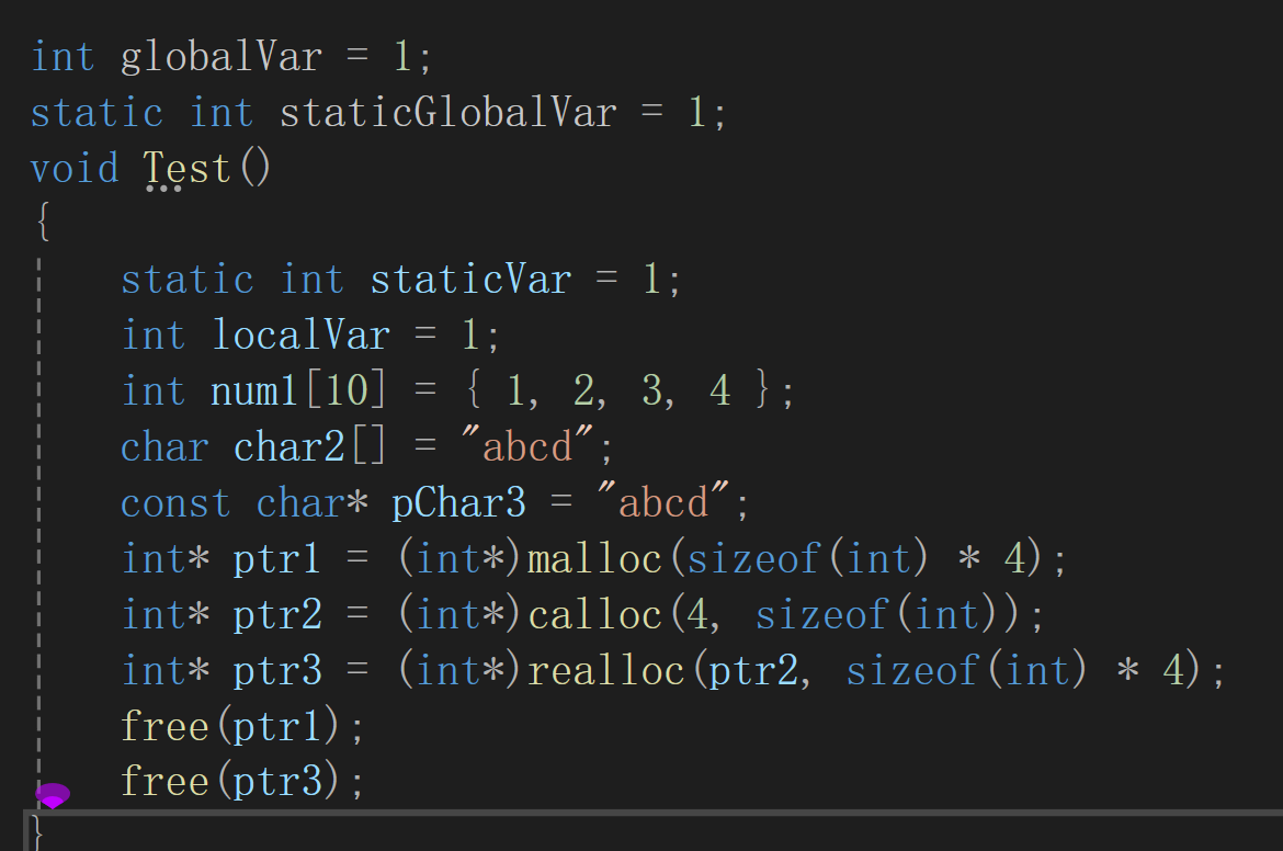 num个大小为size的连续内存(总大小num*size),并将所有字节初始化为 0 - realloc:不初始化新扩展部分,调整已分配内存块的大小:若原块后方有足够空间则原地扩容;否则分配新块、复制原数据并释放原块,返回新地址;