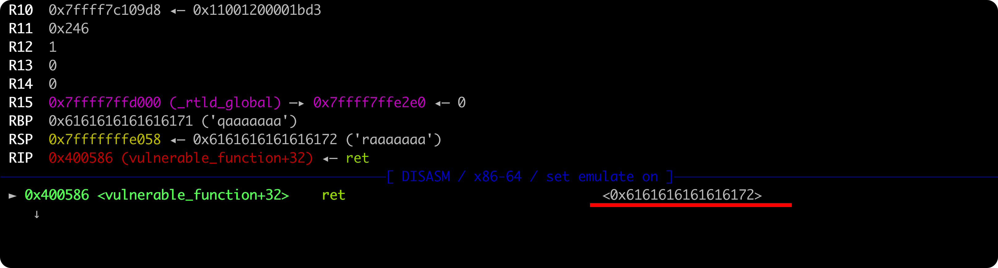 Finding cyclic pattern of 8 bytes: b'raaaaaaa' (hex: 0x7261616161616161)