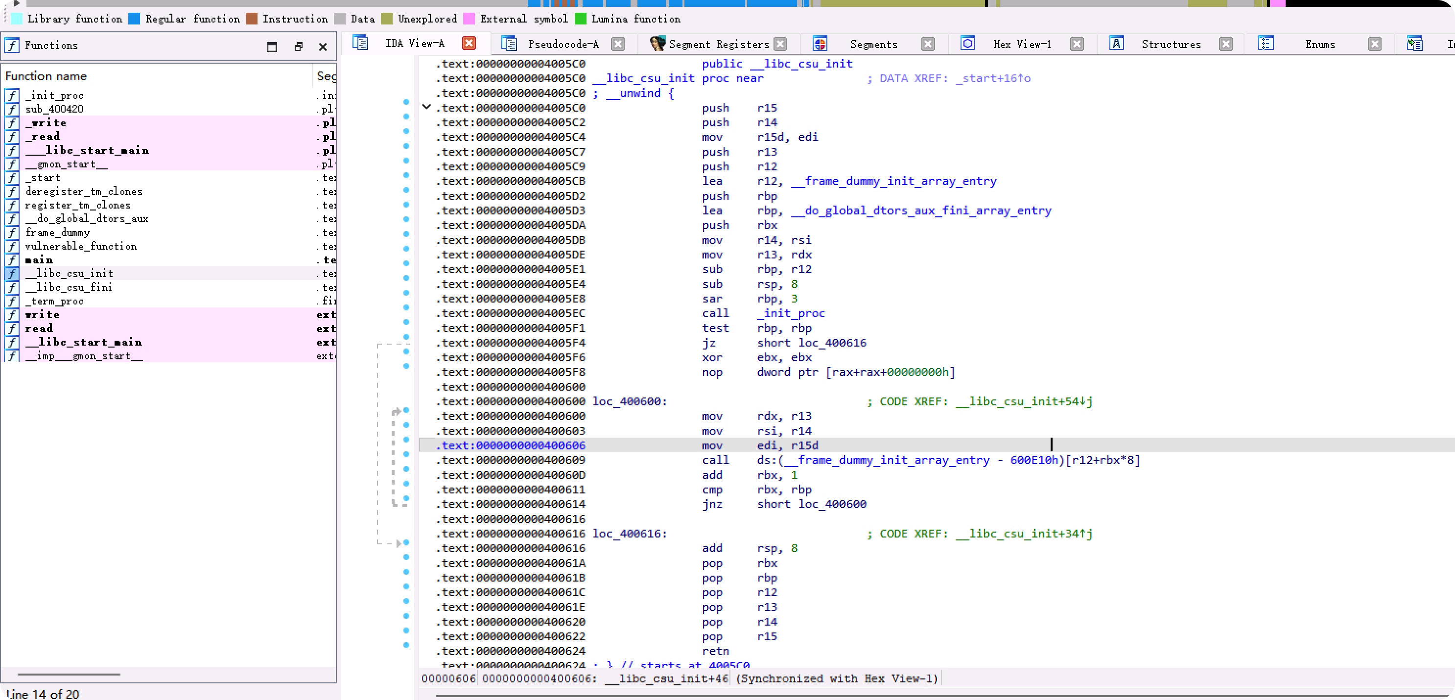 根据CTFWiki介绍,在x64下,默认存在libc初始化的方法,即__libc_csu_init,其内部包含了众多可被使用的Gadgets。