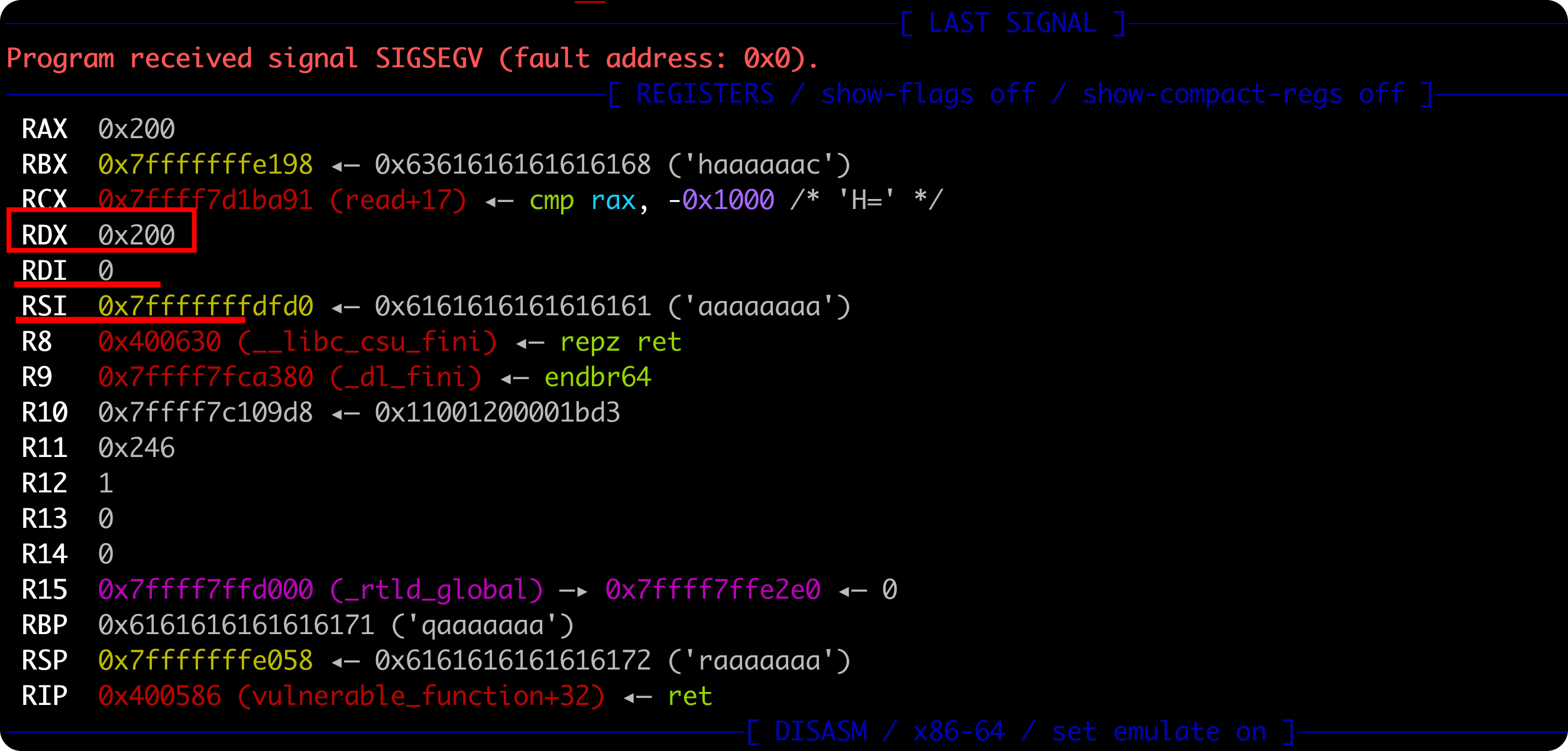 看了下这题好像有点问题,正常来说ret2csu是为了控制RDX,但本题RDX默认给的200,也就是足够溢出,所以没管他,那只需要构造RDI、RSI即可。