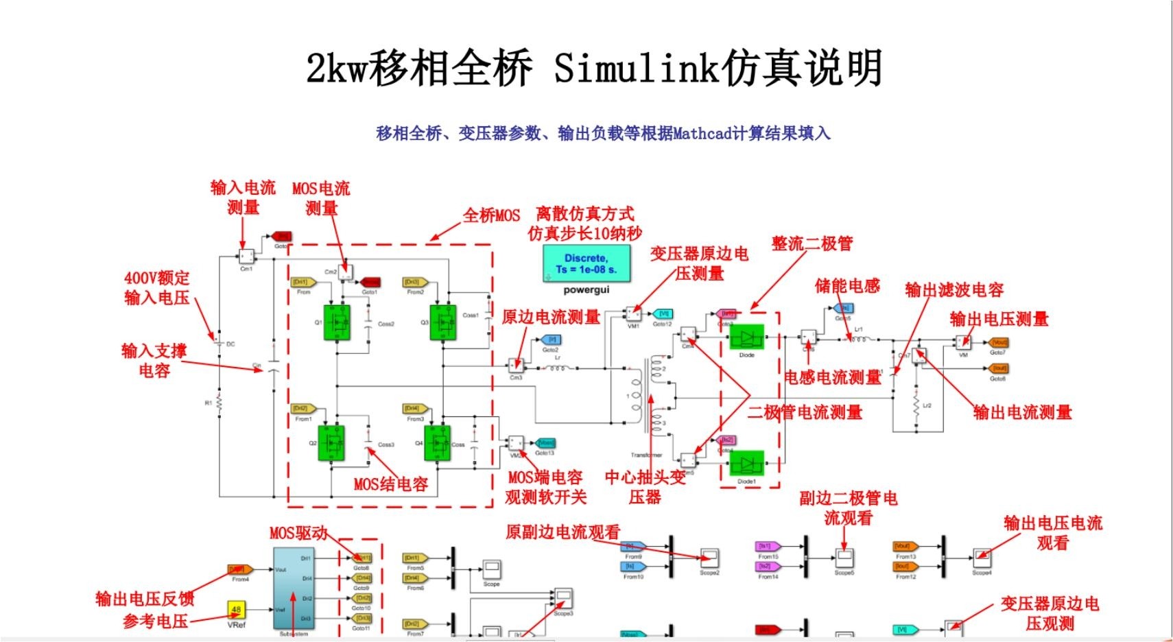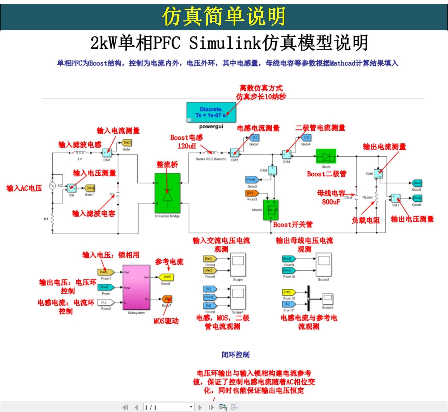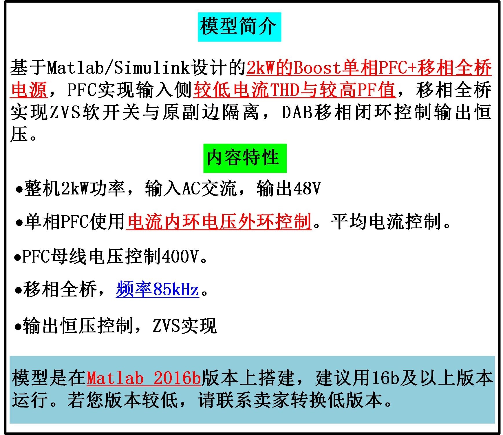 单相Boost PFC移相全桥整机Matlab Simulink仿真模型 2kwboost单相PFC,移向全桥matlab仿真模型,模型说明,详细的计算过程,如变压器电感计算,x电容计算等,pfc设计参考资料,移向全桥参考资料等。