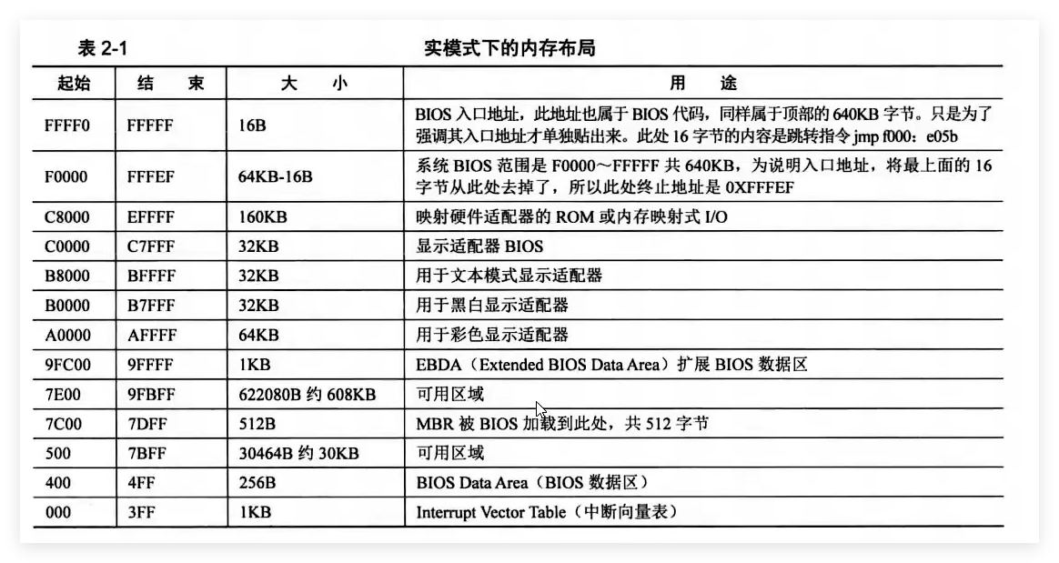 0xFFFF0处存放着一条跳转指令,用于跳转到BIOS程序,BIOS程序会对0盘0道1扇区的最后两个字节进行校验查看是否存放的是MBR主引导记录,如果是0x55,0xaa,就会将改扇区的512字节加载到内存0x7C00处