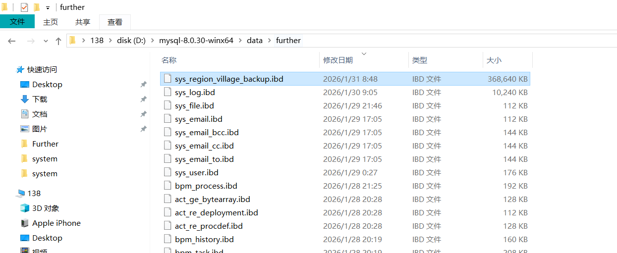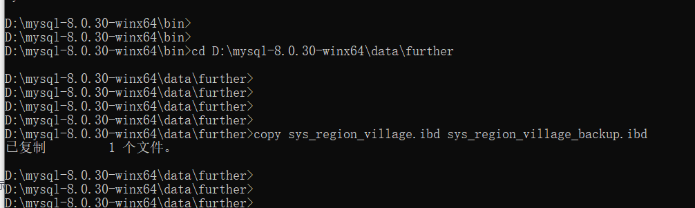 D:\mysql-8.0.30-winx64\data\further>copy sys_region_village.ibd sys_region_village_backup.ibd
