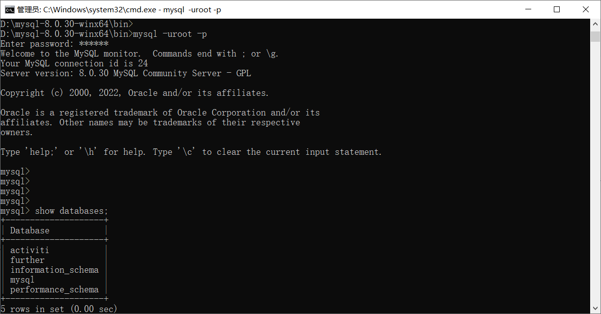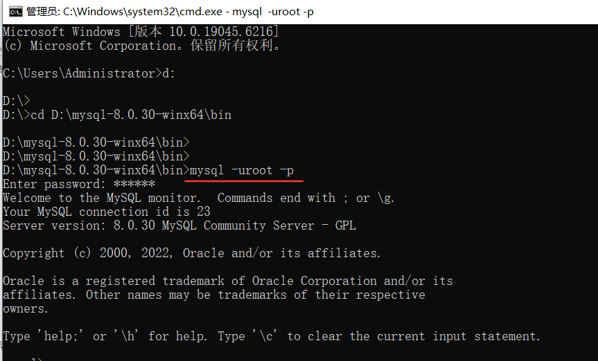 D:\mysql-8.0.30-winx64\bin>mysql -uroot -p