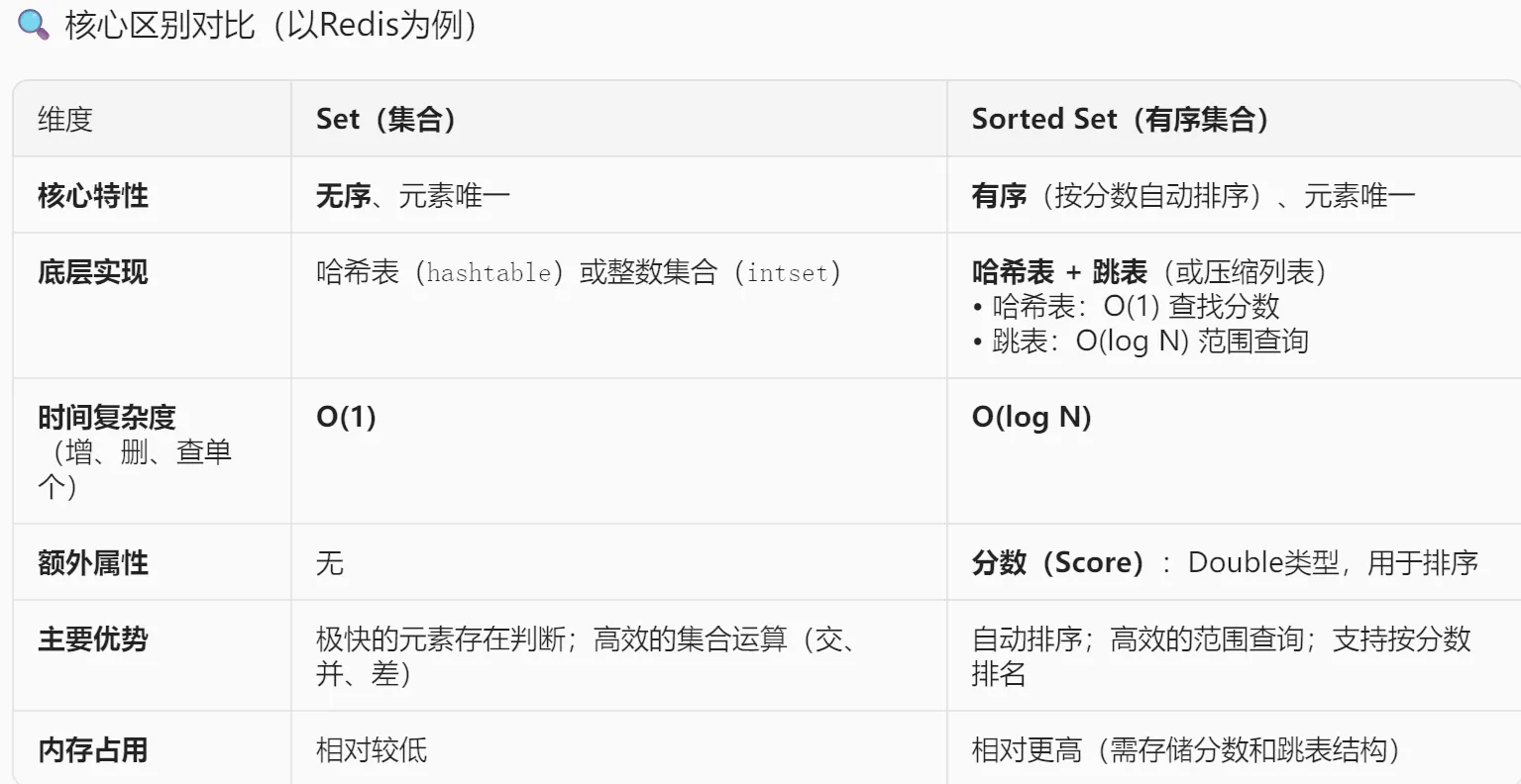 Set与Sorted Set最根本的区别在于是否有序------Set存储无序的唯一元素,Sorted Set则通过分数(Score)为每个元素排序。