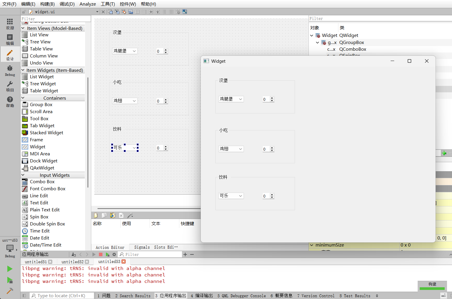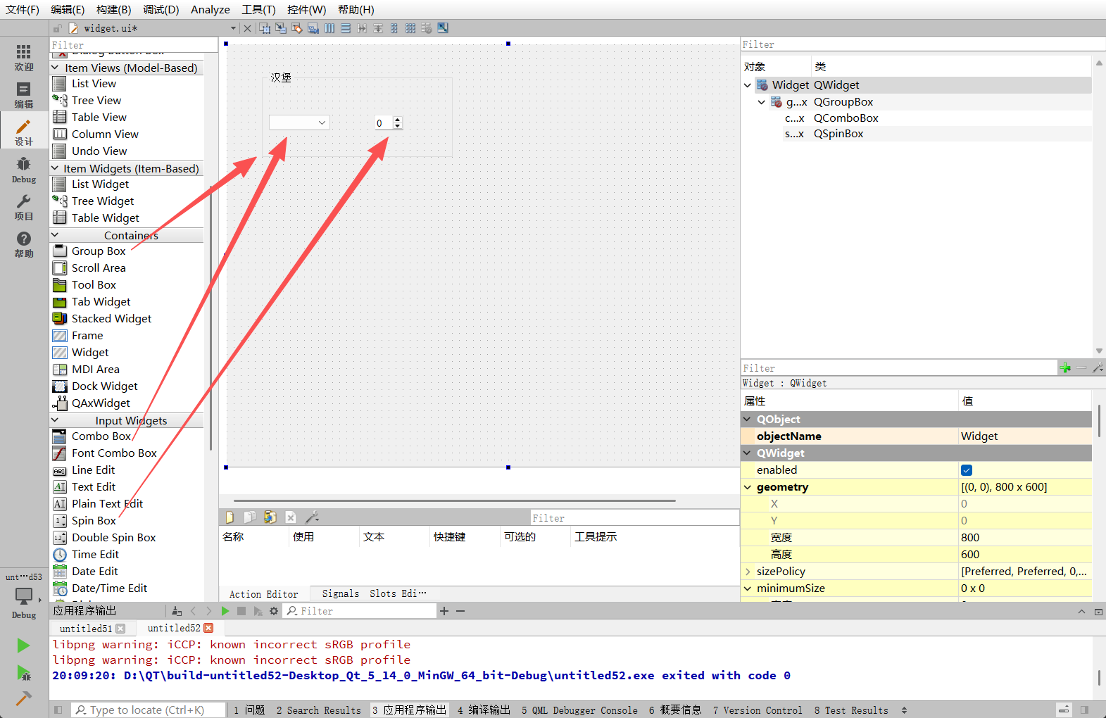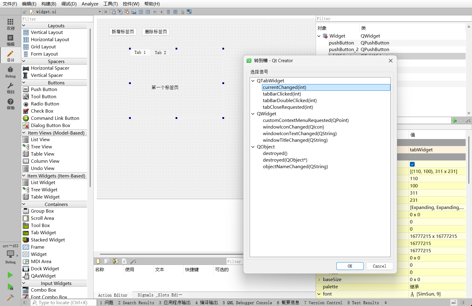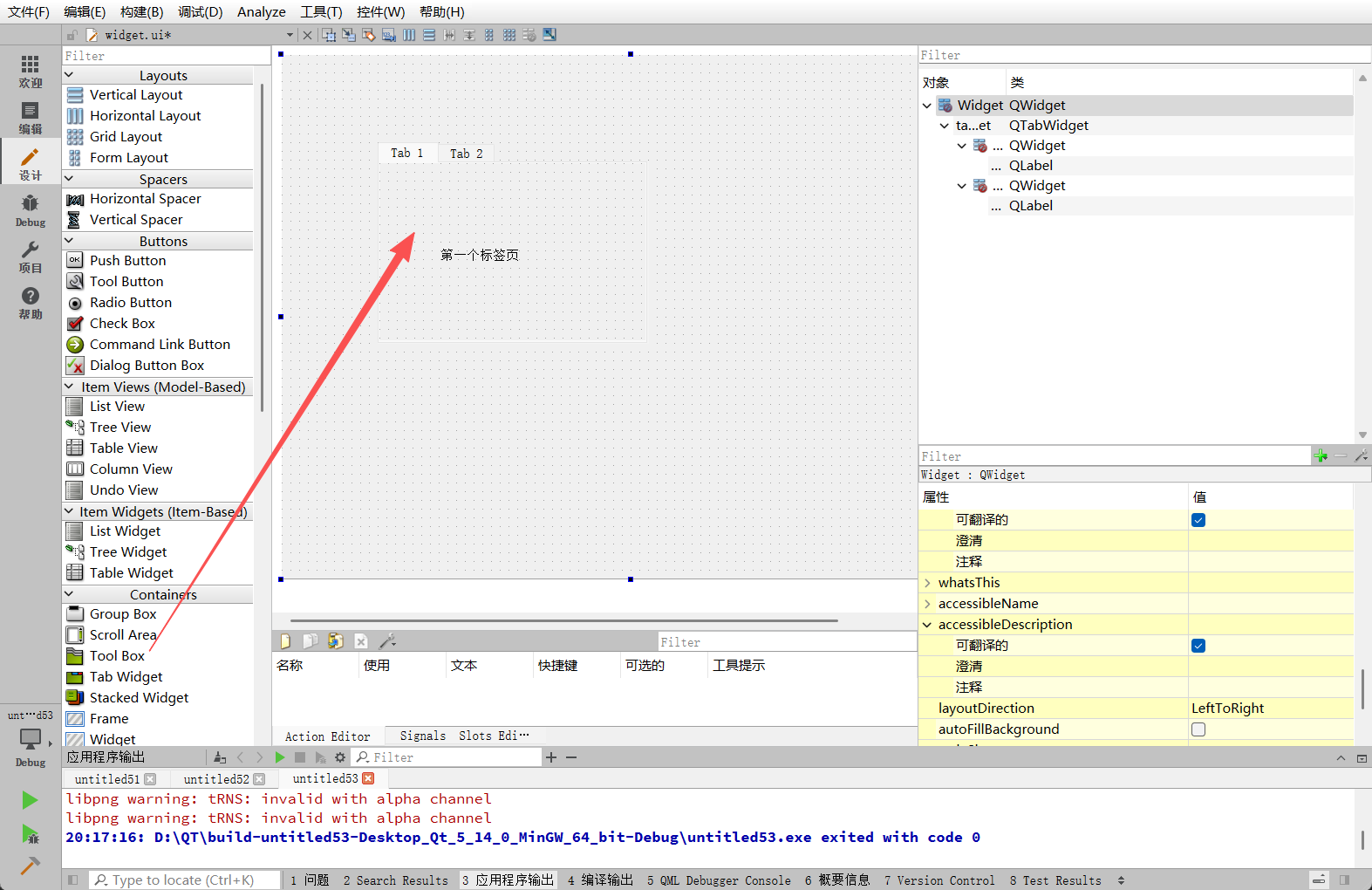 首先对默认存在的两个标签页进行内容填充。可以通过ui->tab和ui->tab_2直接访问设计器中生成的页面对象,并向其指定父对象来添加子控件。