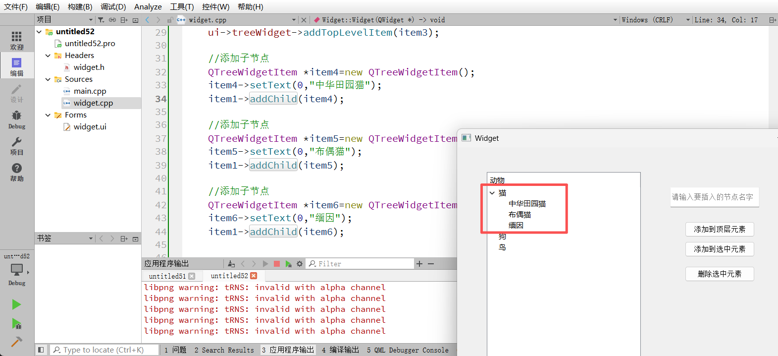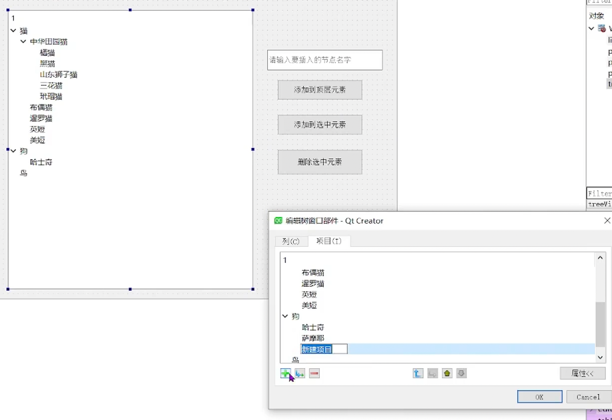 树形结构的核心在于嵌套。通过创建新的QTreeWidgetItem并调用父节点的addChild方法,可以构建出深层的层级关系。例如,在"猫"这个分类下添加"中华田园猫"。