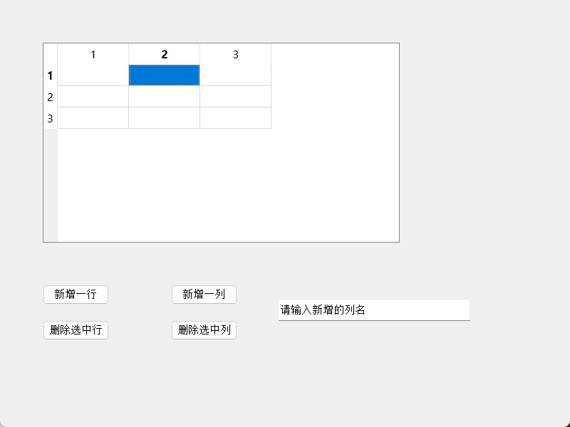 新增列的逻辑与新增行类似,利用columnCount()确定插入位置。不同之处在于,新增列后通常需要立即设置列头,以便用户识别该列的用途。代码中读取了lineEdit输入框中的文本,作为新列的标题。