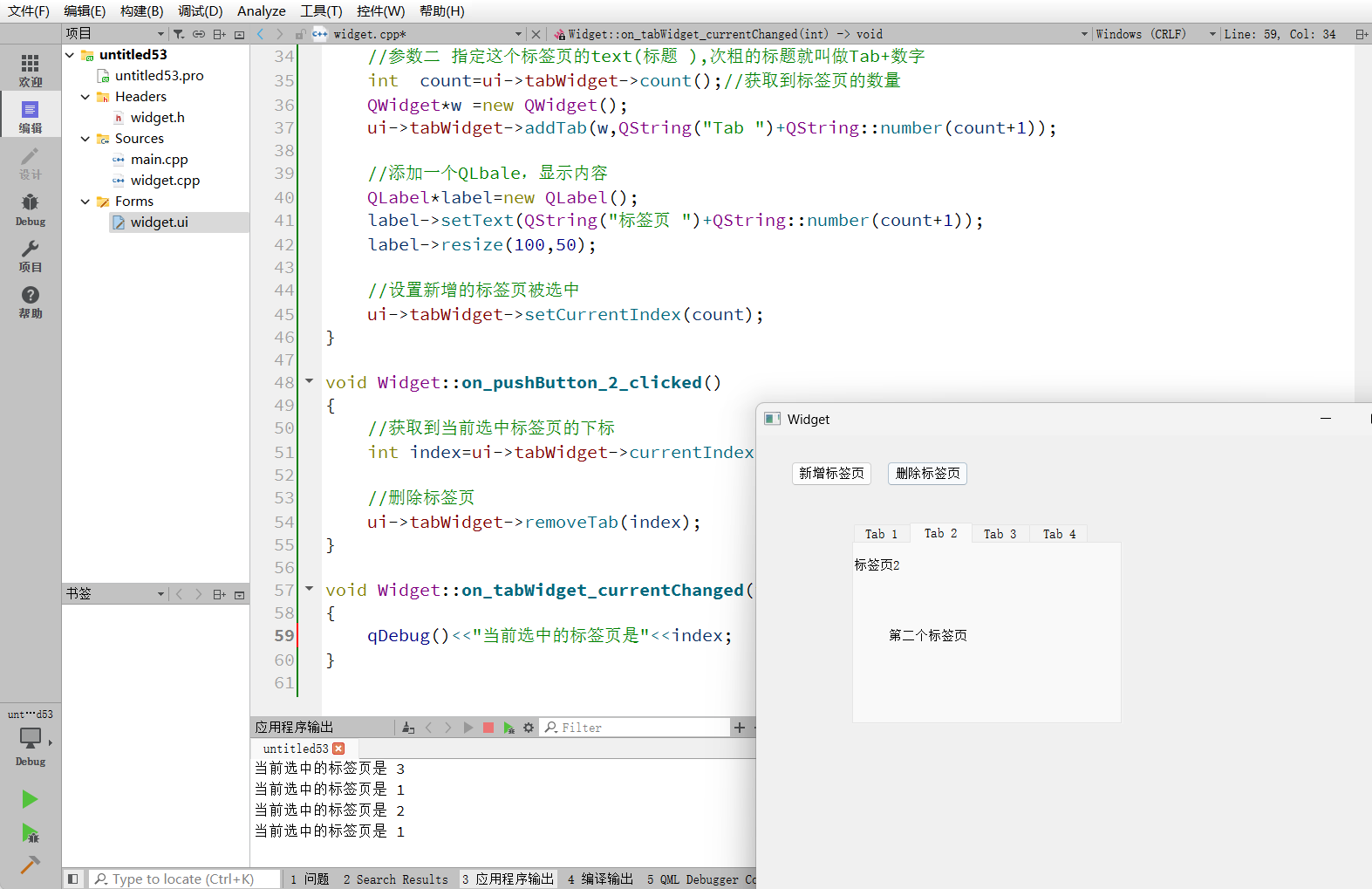 删除操作依赖于当前选中的索引,通过currentIndex()获取,再调用removeTab()移除。