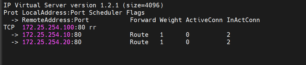 - 结合服务端口: ipvsadm -Ln --virtaddr 172.25.254.100:80