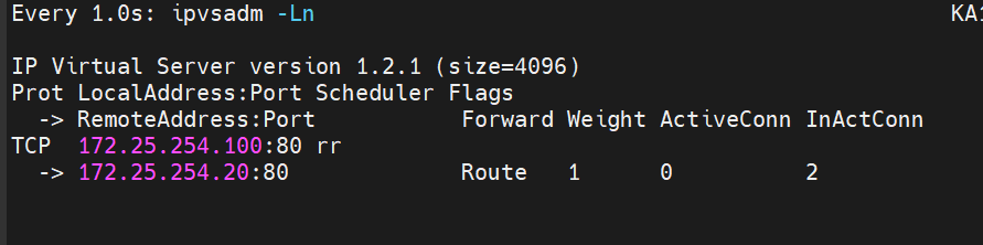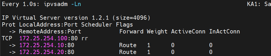 查看ka1中是否自动生成新的lvs策略[root@KA1 ~]# watch -n 1 ipvsadm -Ln