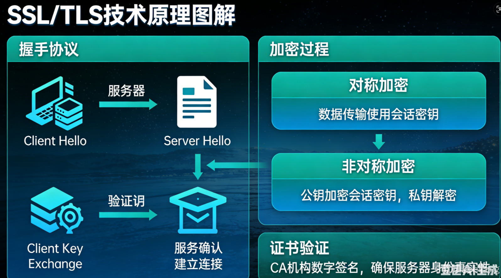 SSL/TLS 是现代互联网安全的基石,它为 HTTP、FTP、SMTP 等应用层协议提供了加密、身份验证和数据完整性保障。下面我将为您详细解析 SSL/TLS 加密的工作原理、握手过程、关键组件及安全特性。现代互联网的黄金法则 :任何敏感数据(登录凭证、个人信息、支付详情)的传输都必须通过 TLS 加密。 它是保护我们数字生活隐私和安全不可或缺的技术屏障。