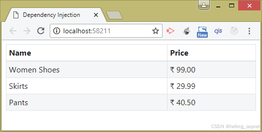 您可以清楚地看到,在索引操作方法中,我创建了一个新的 Repository 类对象,并调用了它的 Products 属性new Repository().Products。该属性返回字典中存储的所有 3 个产品。最后,我将这些产品返回给视图。