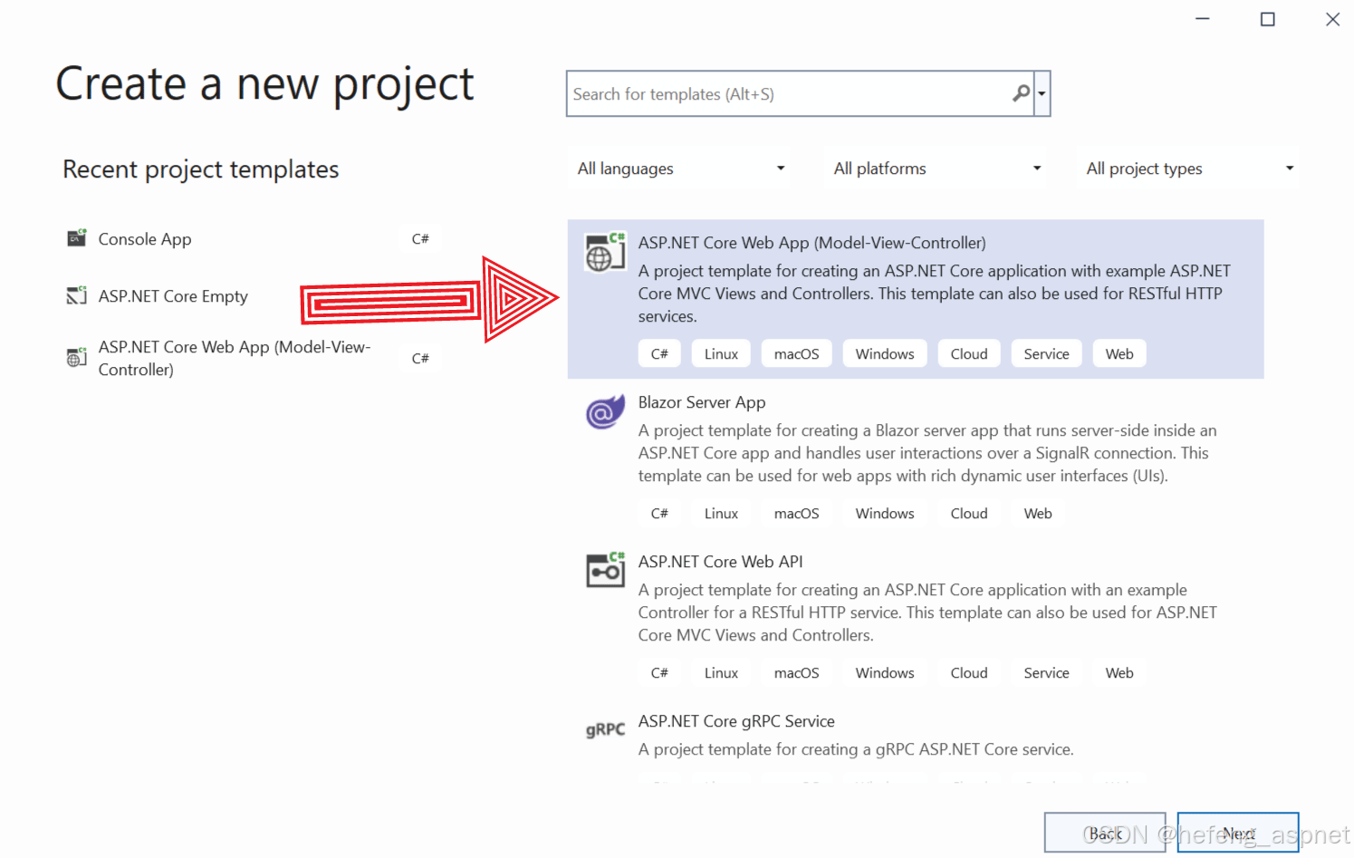 打开Visual Studio 2022 ,选择ASP.NET Core Web 应用程序(模型-视图-控制器)模板创建一个新项目。请确保选择**.Net 6.0 框架**。