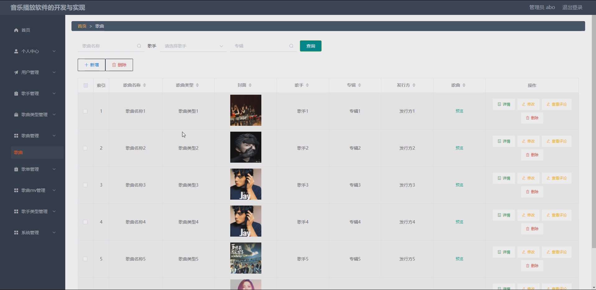 - 专辑模块:实现专辑信息的管理,关联歌手模块,支持专辑的增删改查,可查看专辑内的关联歌曲;