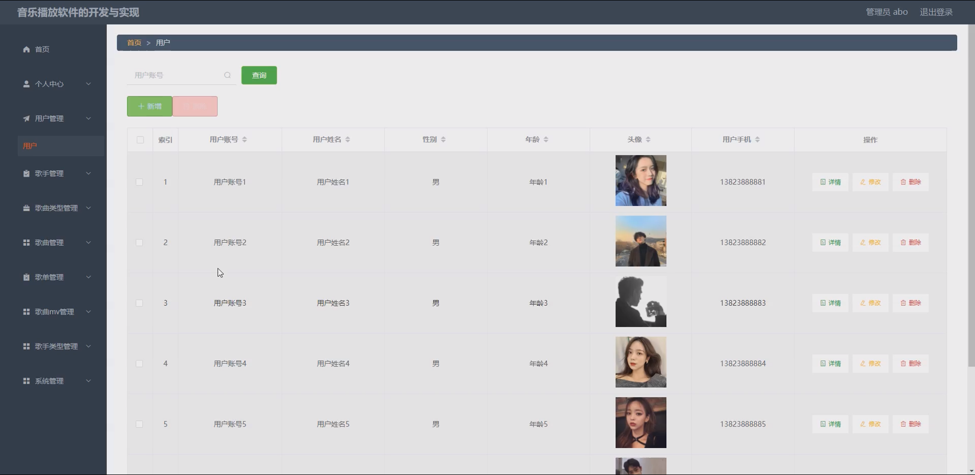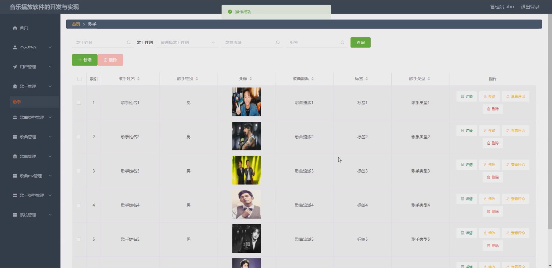 - 歌手模块:实现歌手信息的管理,关联歌手类型模块,支持歌手信息的增删改查,可查看歌手关联的歌曲、专辑与 MV;