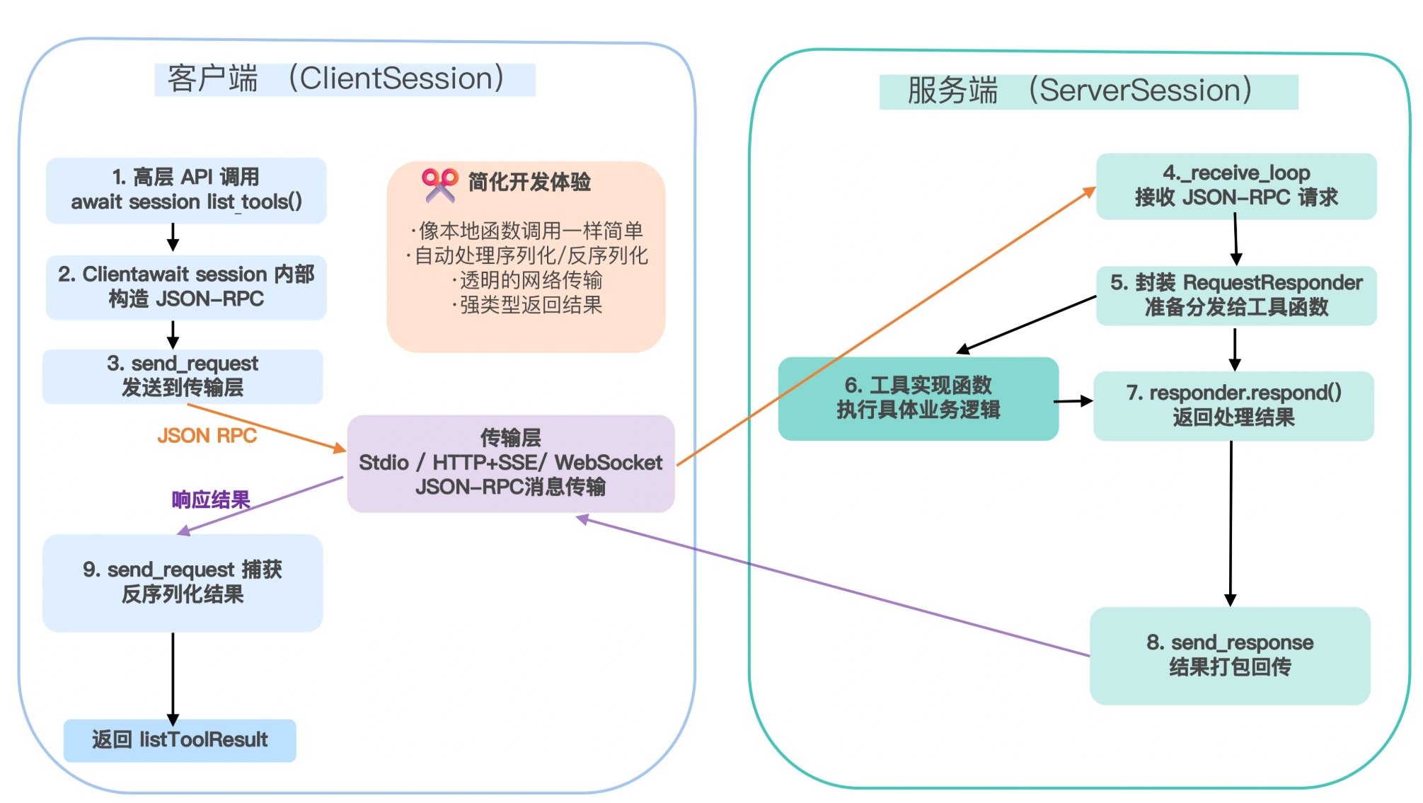 🔵在交互过程中,任何一方都只需像调用本地函数一样发起高层 API 调用。例如,客户端只要执行 await session.list_tools(),ClientSession 就会在内部构造一个 JSON-RPC 请求,将其通过 send_request 发出,并在 ServerSession 的 _receive_loop 中被接收,随后被封装成一个 RequestResponder 并交给注册在服务器端的工具实现函数处理;工具函数执行完成后调用 responder.respond(),ServerSession 底层的 _send_response 将结果打包回传,最后在客户端的 send_request 中被捕获并反序列化成 ListToolsResult 返回给调用者。