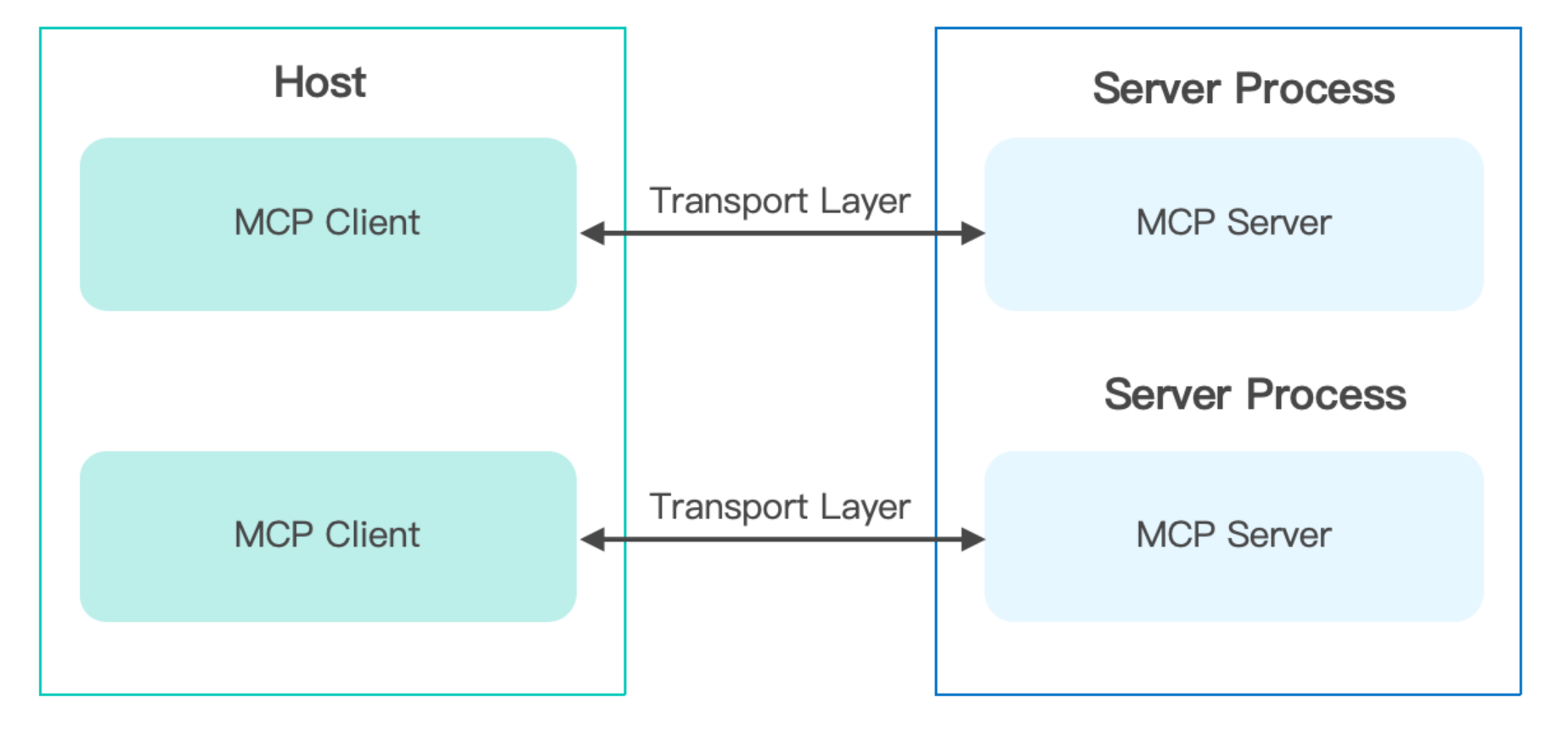 🔴在 MCP 的典型部署中,首先由 Host 应用在启动时分别实例化 ClientSession 和 ServerSession,并将二者的底层读写流对接:本地场景通常将一个进程的标准输出连向另一个进程的标准输入,而远程场景则可以通过 HTTP 与 SSE 通道互联。