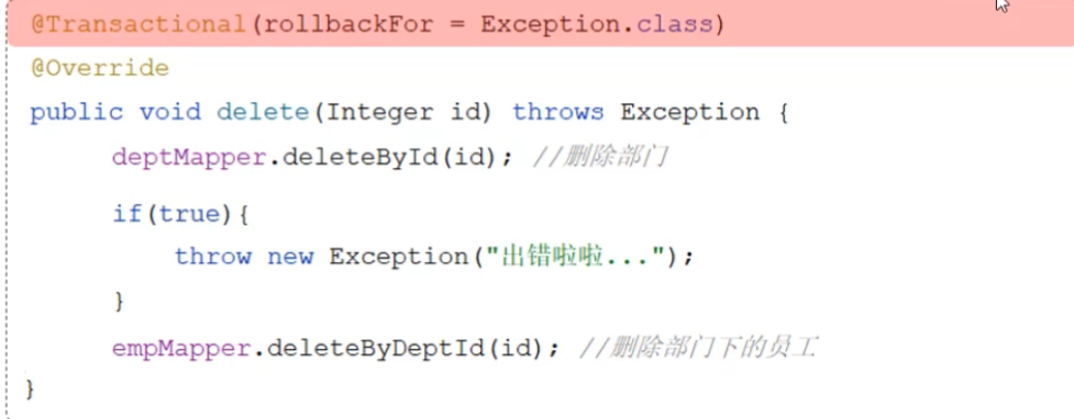 前言:在我们前面学习的案例中,其中执行删除操作时,会产生bug,当我们删除部门时,实际上部门下的员工信息应该也消失了,但是查询之后,我们发现有异常时,仅仅是删除了部分,员工数据还存在,造成是偏差,这时我们就可以把这两个事件捆绑成一个事务,即使出现异常时,也能执行回滚事务,保持数据的一致。