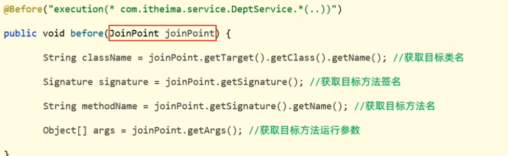 在Spring中用JoinPoint抽象了连接点,用它可以获得方法执行时的相关信息,如目标类名、方法名、方法参数等。