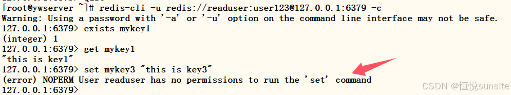 先设置一个只读用户,用只读账户连接测试,我们就可以发现这个用户可以执行get,exists等只读命令,但是不能执行set等写入命令。