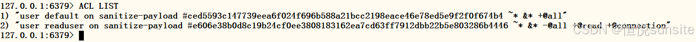 root@ywserver \~\]# mkdir -p /etc/redis \[root@ywserver \~\]# vim /etc/redis/users.acl \[root@ywserver \~\]# systemctl restart redis \[root@ywserver \~\]# cat /etc/redis.conf \|grep users.acl aclfile /etc/redis/users.acl \[root@ywserver \~\]# cat /etc/redis/users.acl user default off user admin on \>admin123 \~\* \&\* +@all user readuser on \>user123 \~\* -@all +@read +ping +info