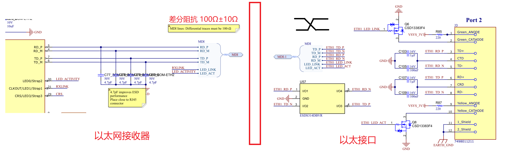 - 差分线(TD±/RD±)下方20mil 范围内必须做完整 GND 铺铜,禁止挖空、走线;
