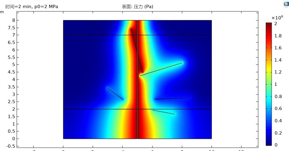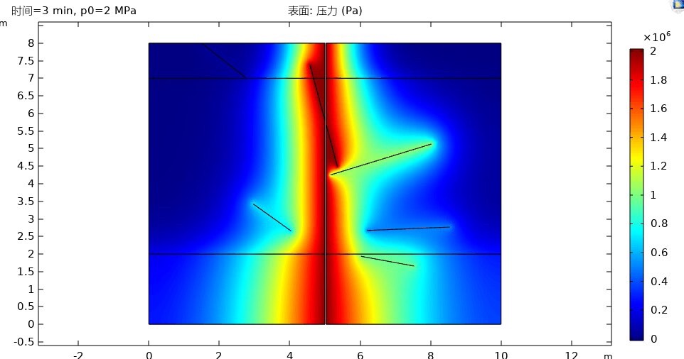 comsol裂隙注浆模拟,案例 考虑三层顶板包含随机裂隙的浆液扩散模型,考虑浆液重力的影响,建立随机裂隙,采用达西定律模块,分析不同注浆压力条件下的浆液扩散规律,建立瞬态模型。 可以明显看到随着时间变化浆液扩散形态,在不同的渗透率下扩散速度的差异性,并且浆液在裂隙中的流动启动压力很小。