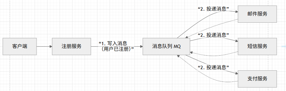 - 注册服务只需要将"用户已注册"这个消息快速写入到消息队列中,然后给用户反馈"注册成功",后续的邮件服务和短信服务等,通过异步的方式,从消息队列中获取到"用户已注册"这个消息,然后进行处理。