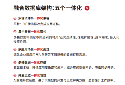 融合数据库架构:最厉害的是它的"融合"架构:一套软件,就能同时兼容 Oracle、MySQL、SQL Server、PostgreSQL 好几种主流语法,开发迁移都省心。数据模型上,不管是传统的关系型数据,还是时髦的文档/JSON、全文、GIS、时序数据,它都能装得下。部署的时候,你可以根据业务对可用性和成本的要求,自由选择集中式或者分布式,非常灵活。
