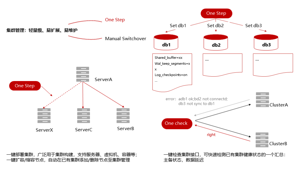 在集群环境下,网络波动时,各节点均会自认为主节点,此现象被称为"脑裂",KES经由守护进程(repmgrd/kbha)及信任网关设置,可规避此类情形,保障集群稳定。