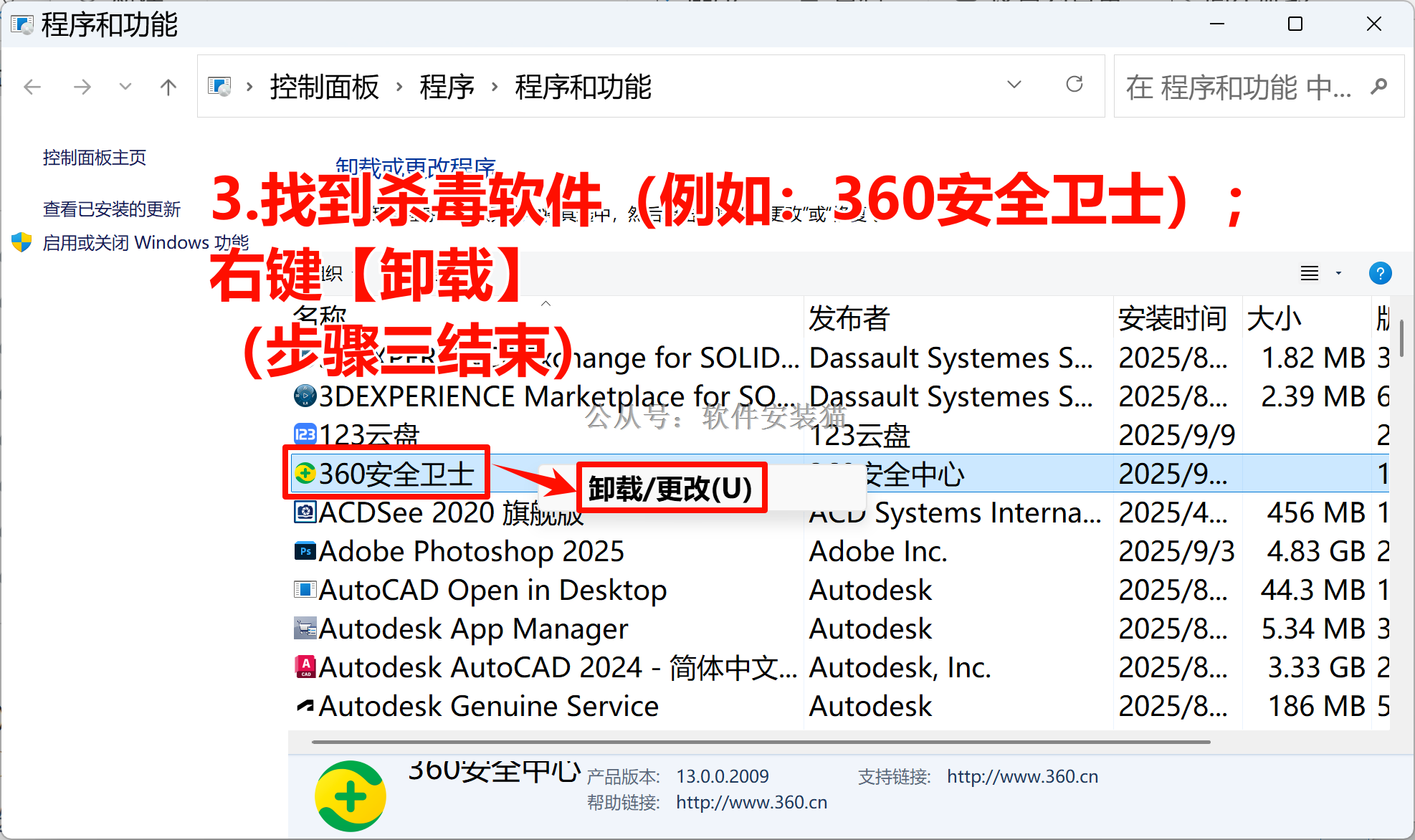 3.找到杀毒软件(例如:360安全卫士);右键【卸载】(步骤三结束)