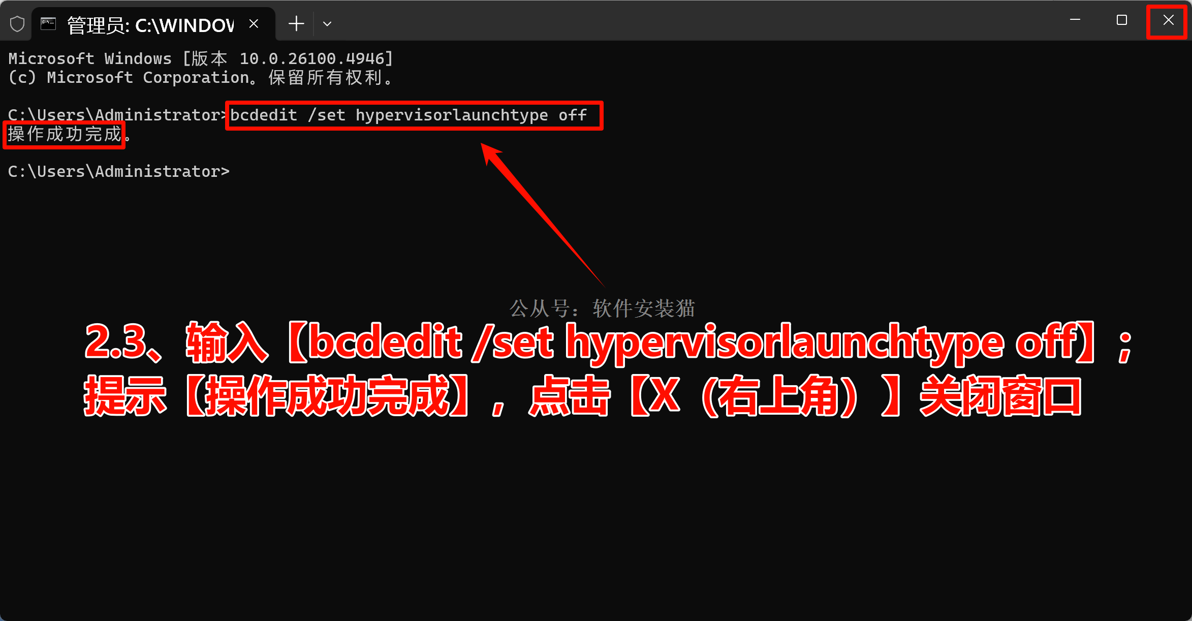 2.3、输入【bcdedit /set hypervisorlaunchtype off】;提示【操作成功完成】,点击【X(右上角)】关闭窗口