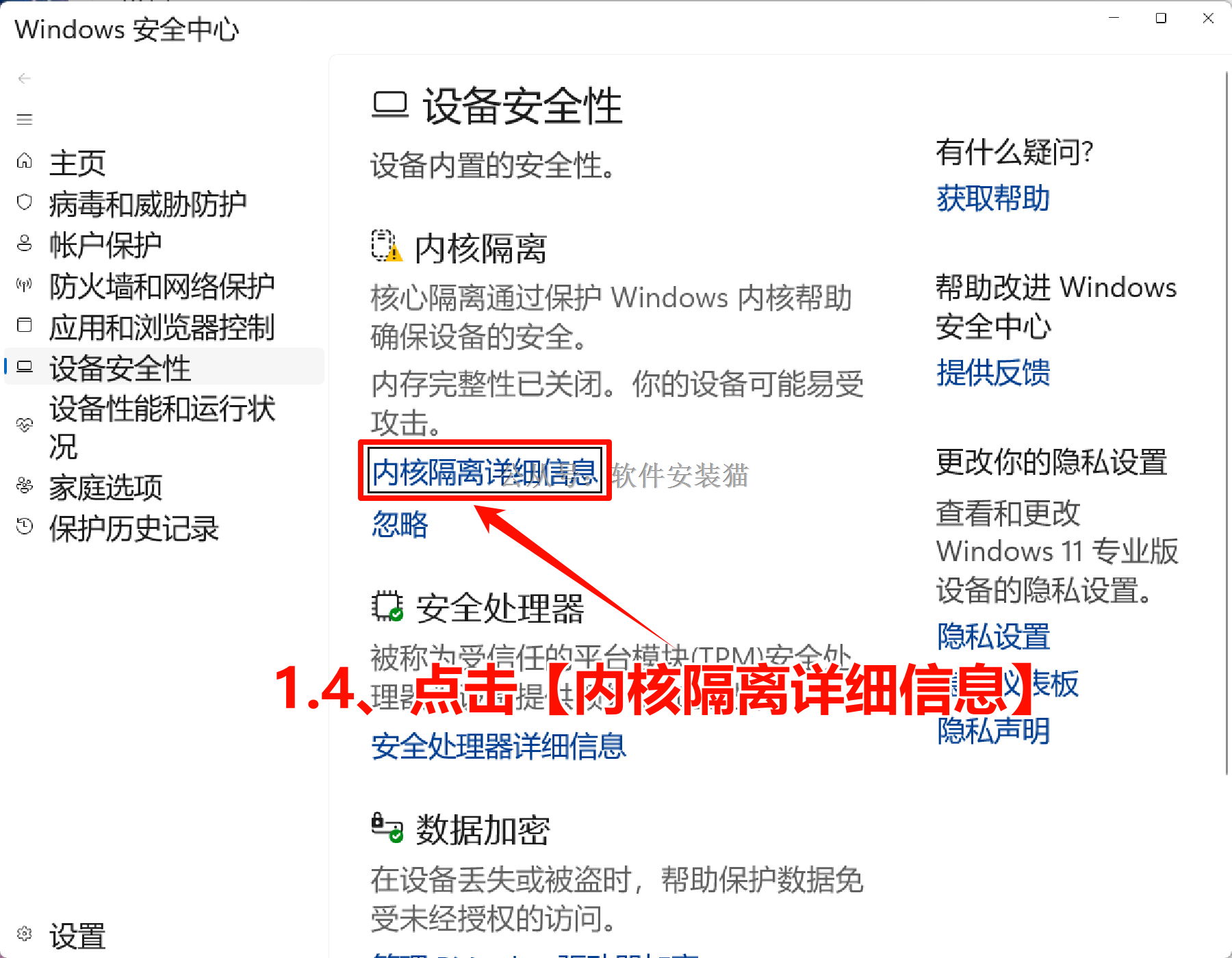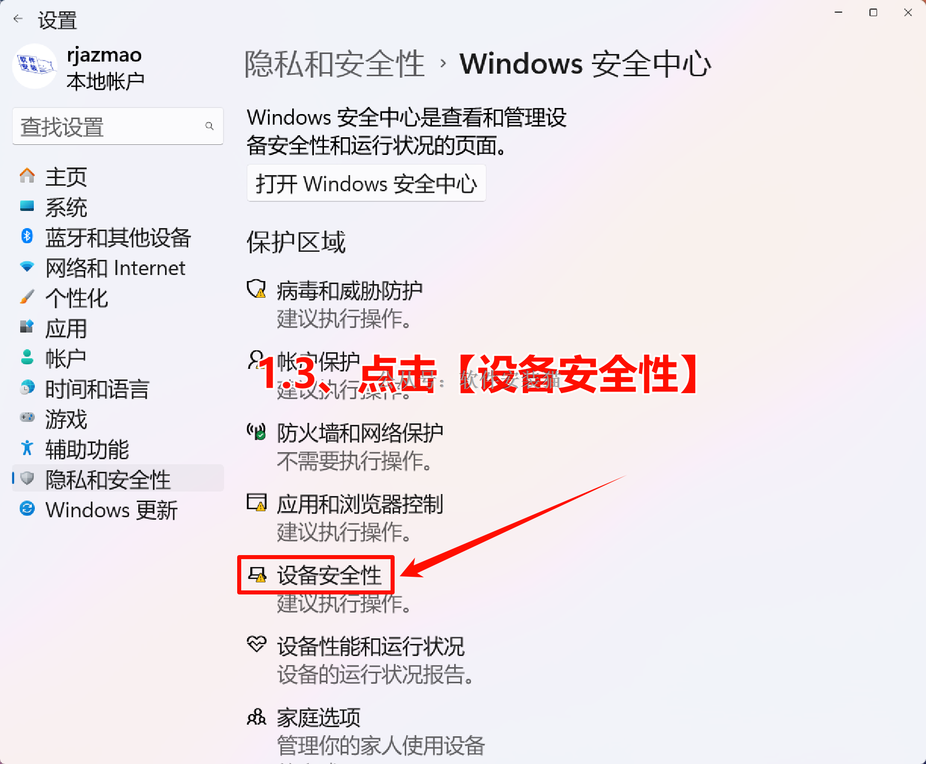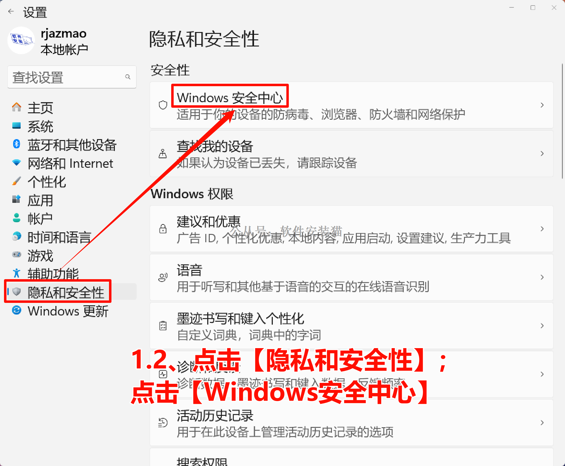 1.2、点击【隐私和安全性】;点击【Windows安全中心】