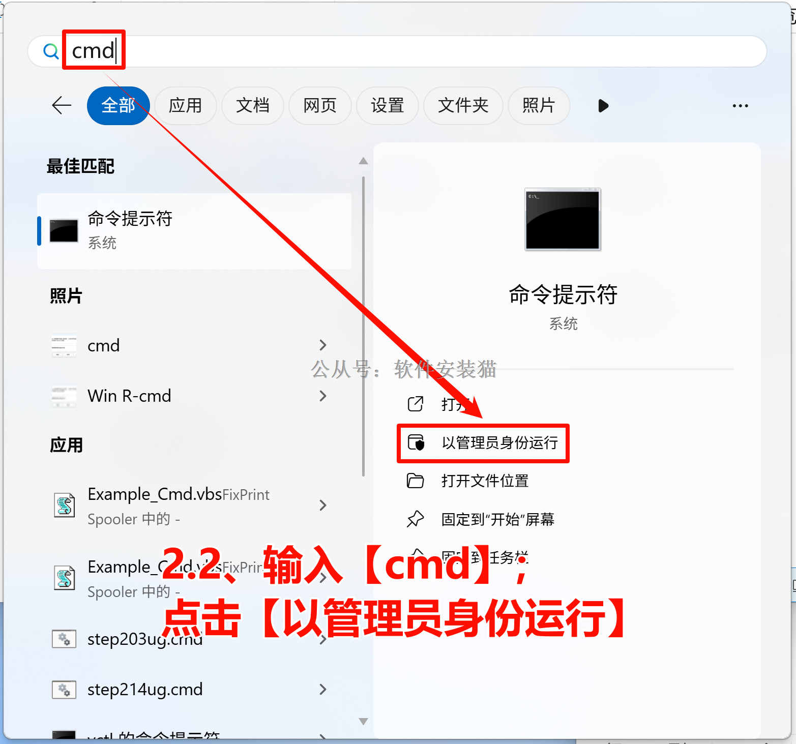 2.2、输入【cmd】;点击【以管理员身份运行】