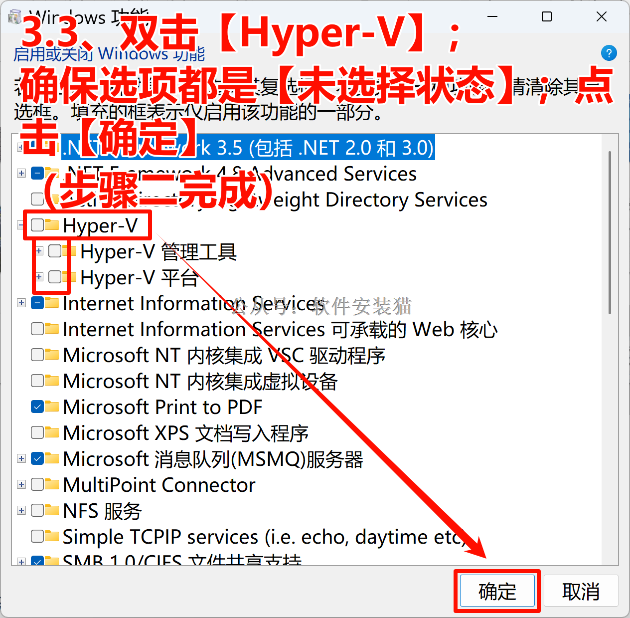 3.3、双击【Hyper-V】;确保选项都是【未选择状态】;点击【确定】(步骤二完成)