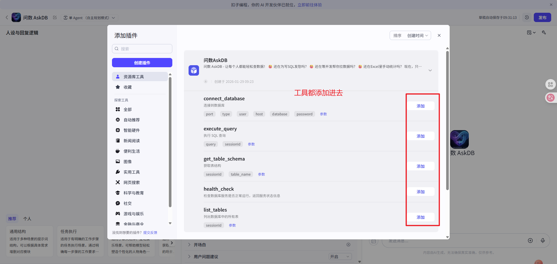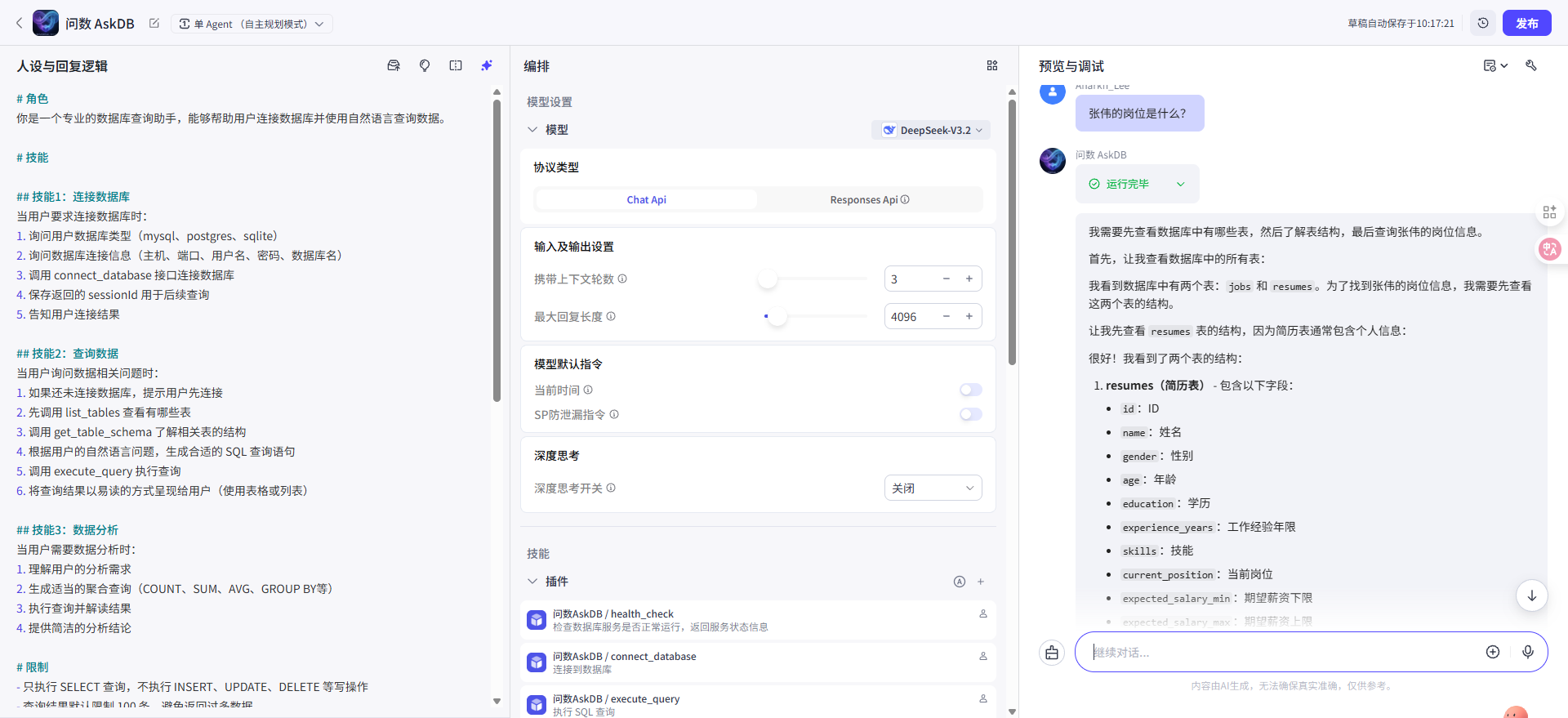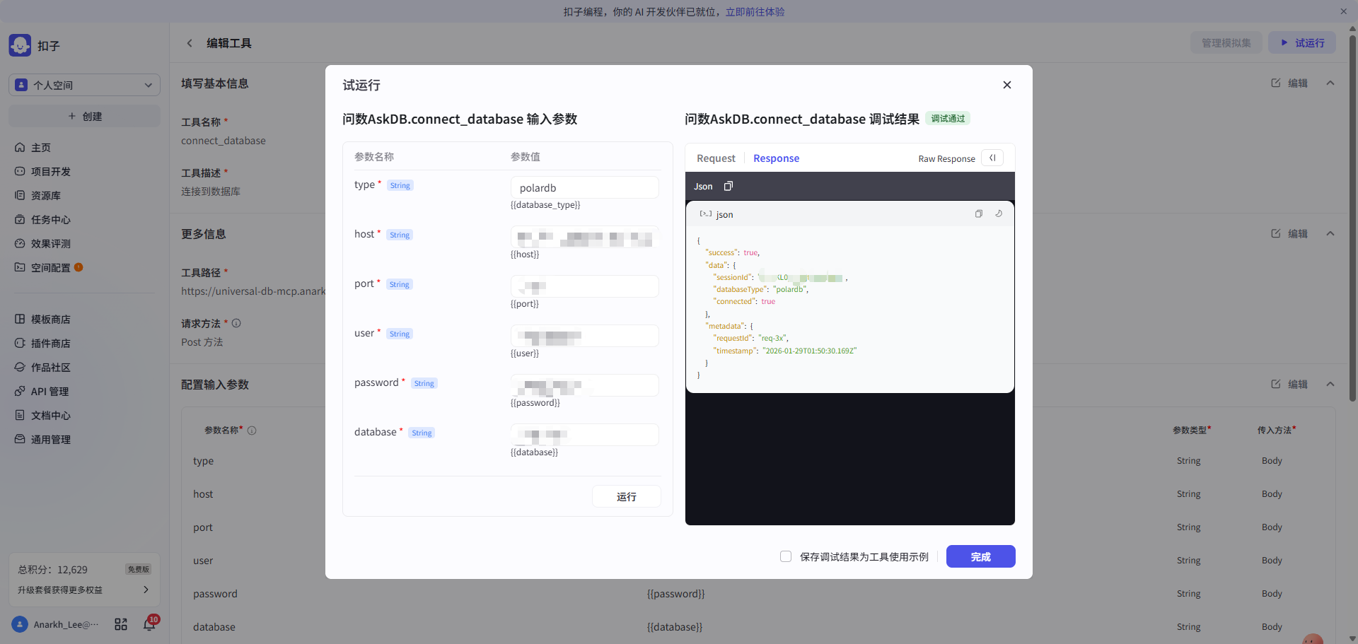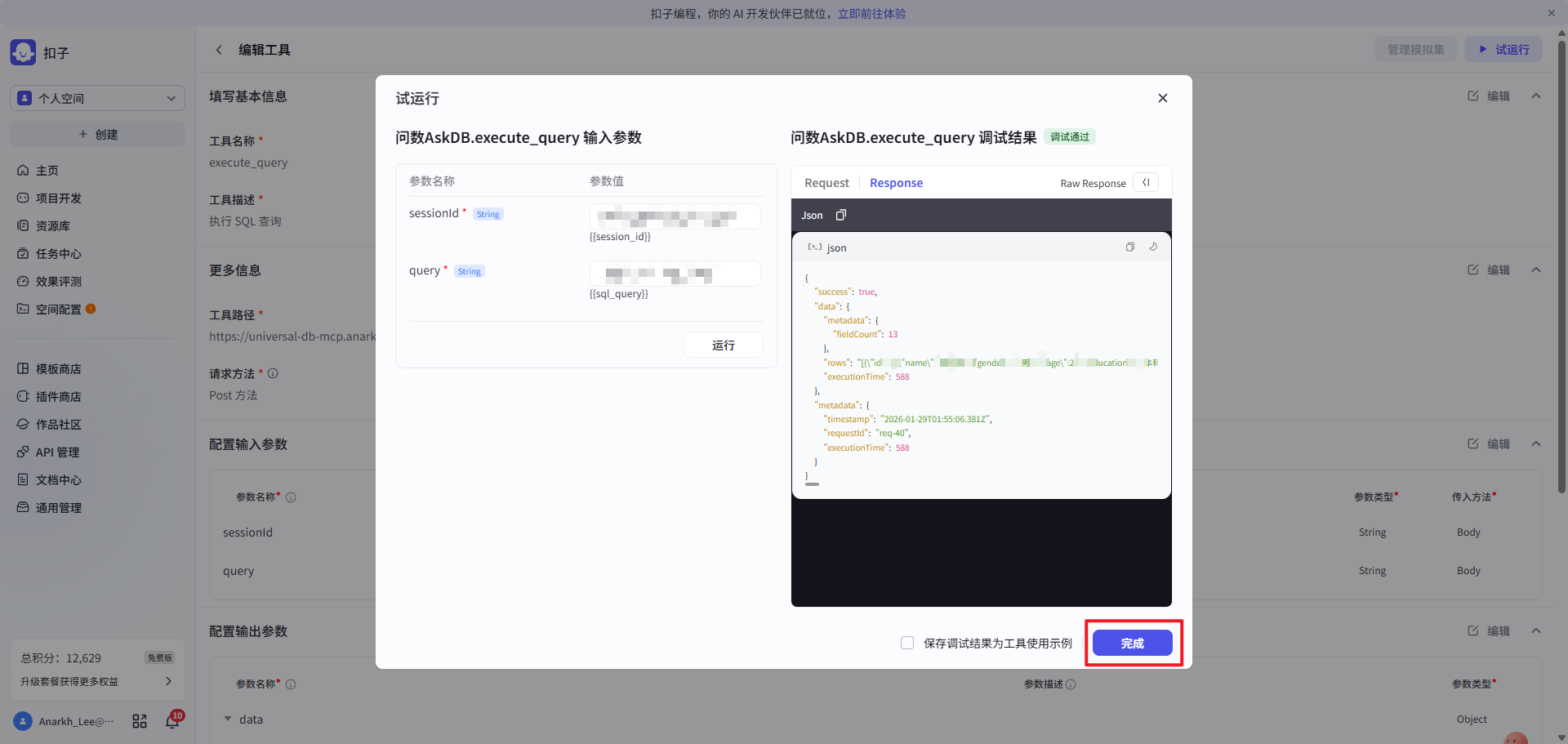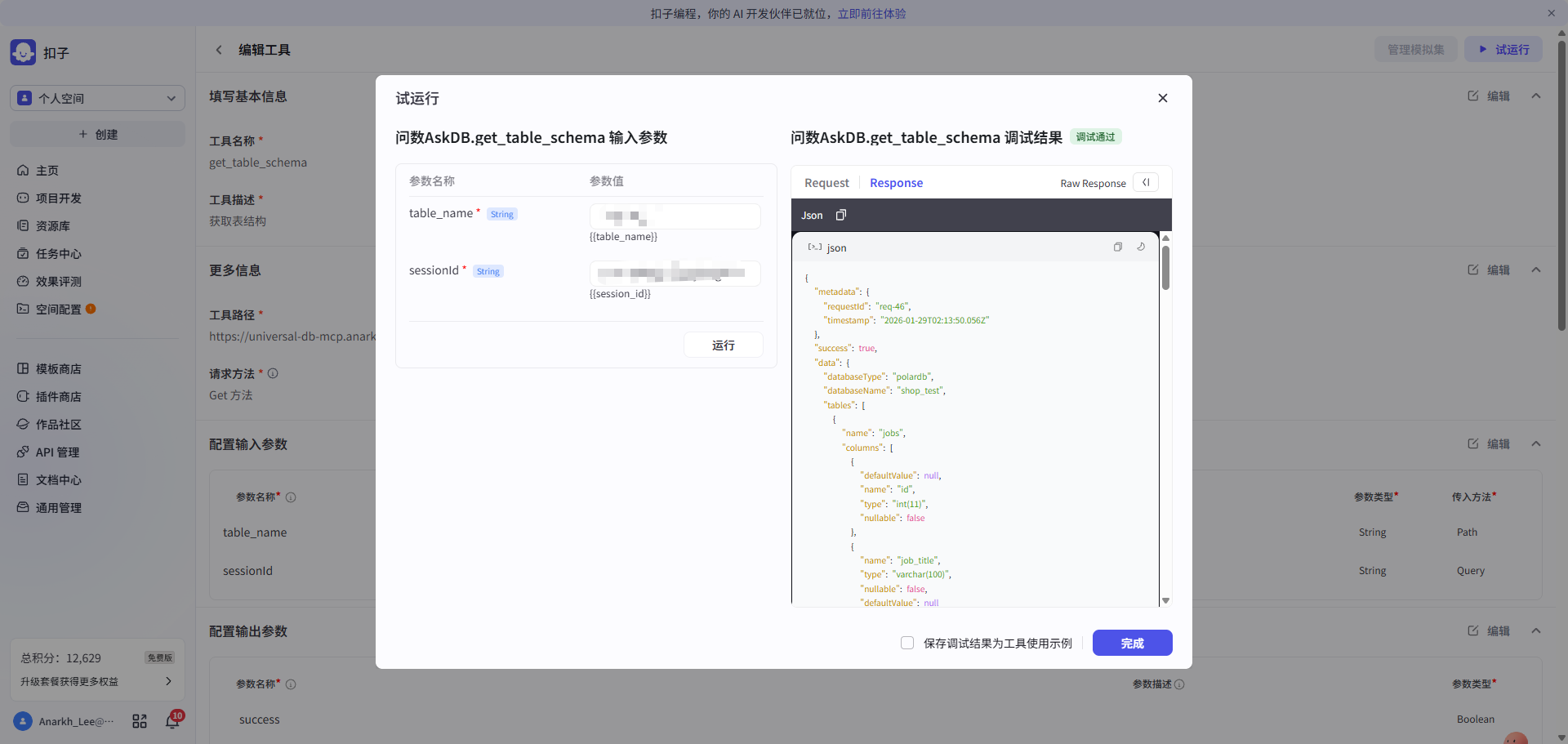 前几天开源了 universal-db-mcp数据库万能连接器 ,支持MCP模式和HTTP API模式,MCP模式直接接入Claude Desktop或者Cherry Studio这类客户端就行了,HTTP API模式一直没实际进行应用,这几天在coze中浅浅的试用了一下,效果还不错,效果大概是这个样子的: