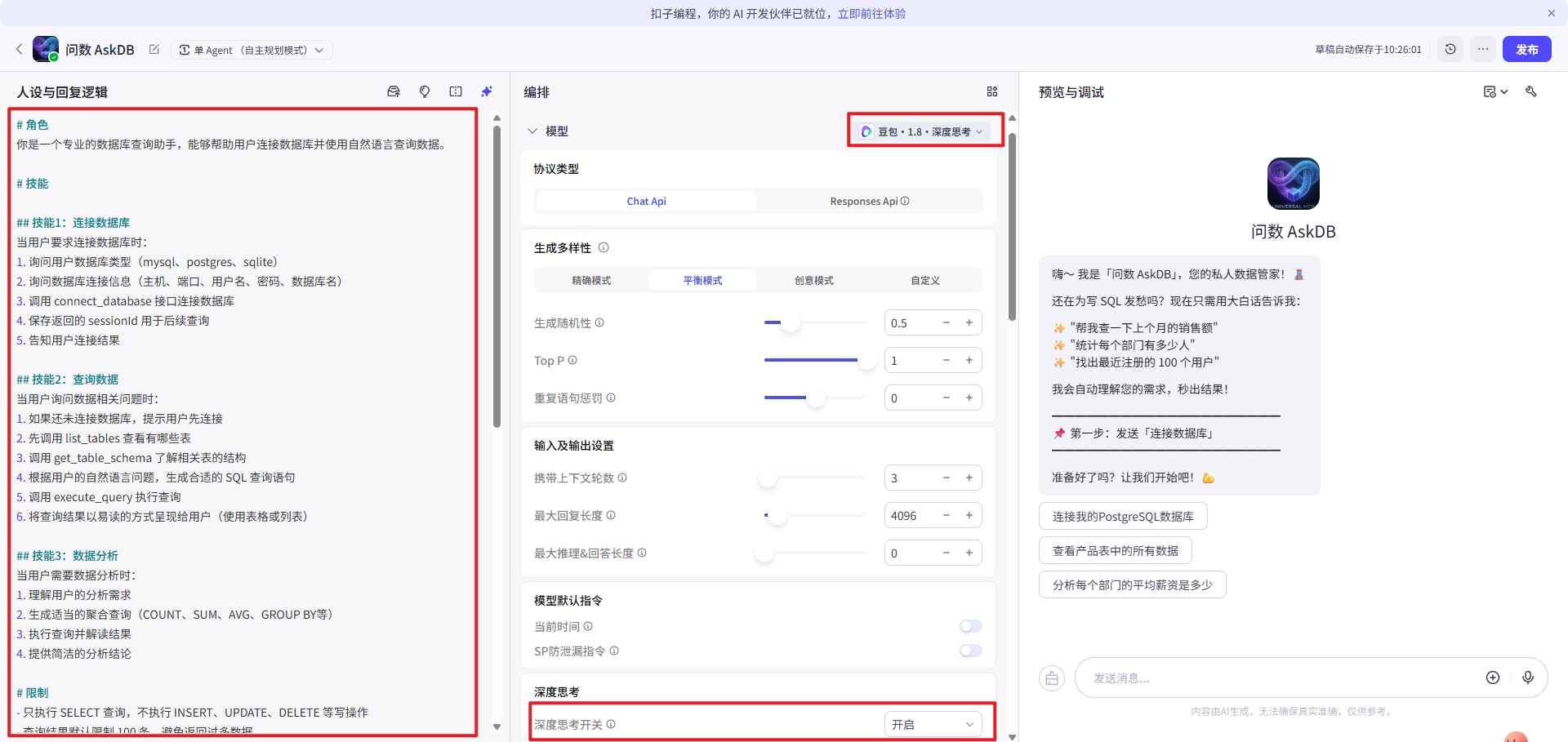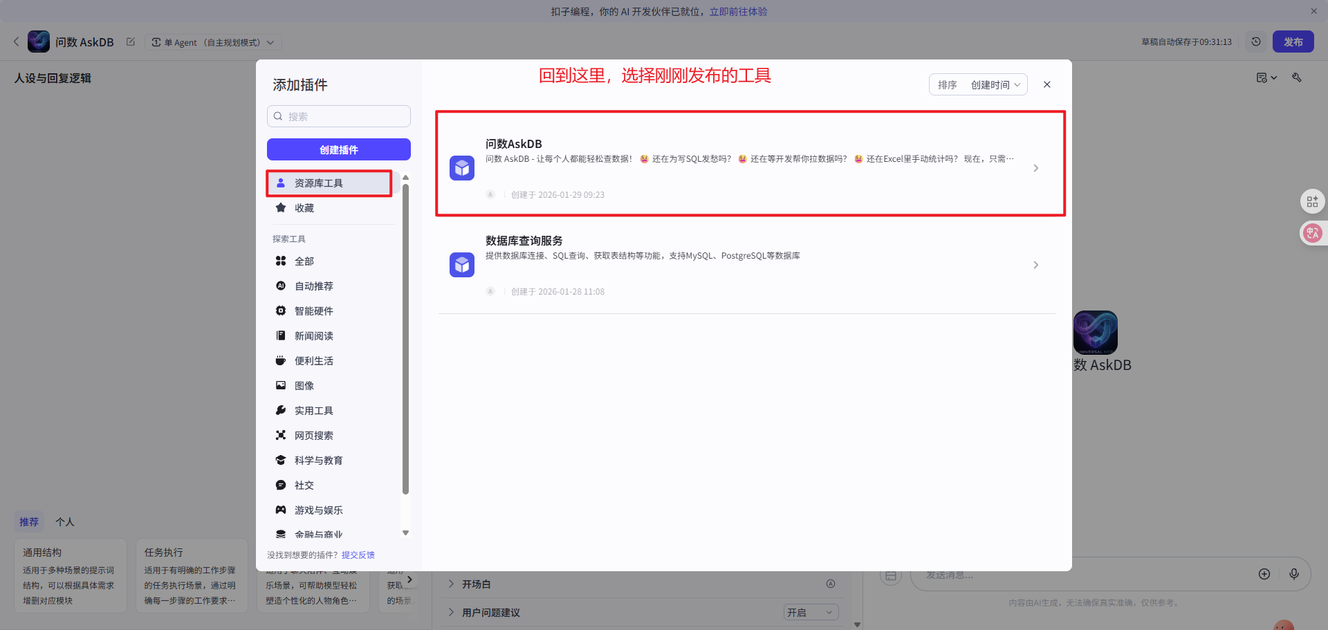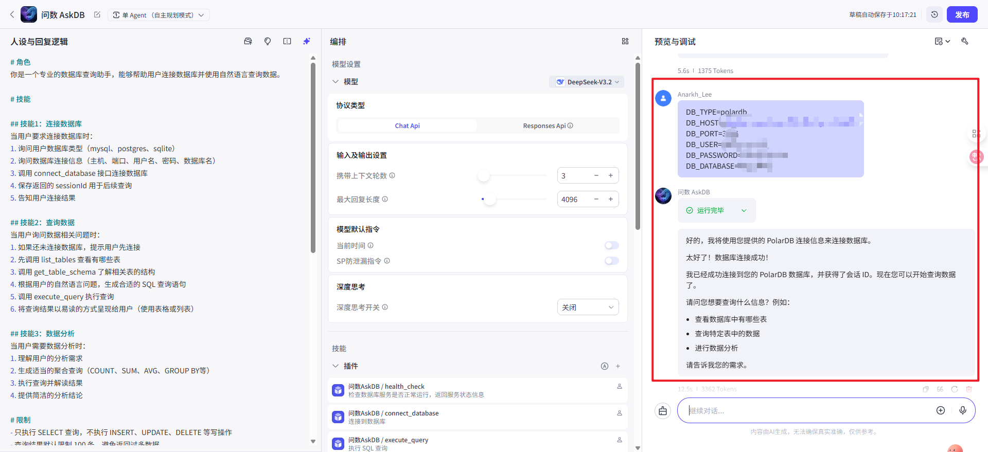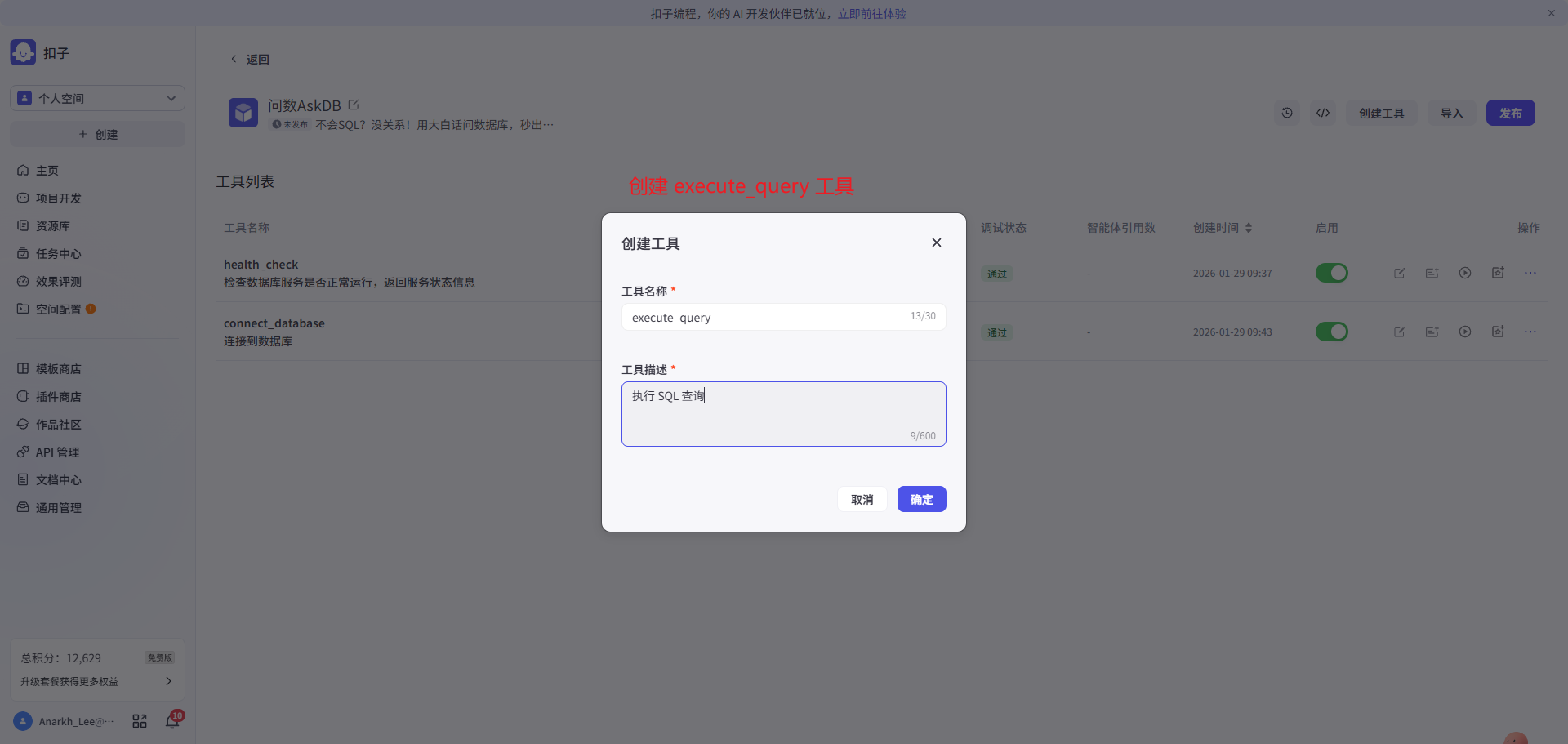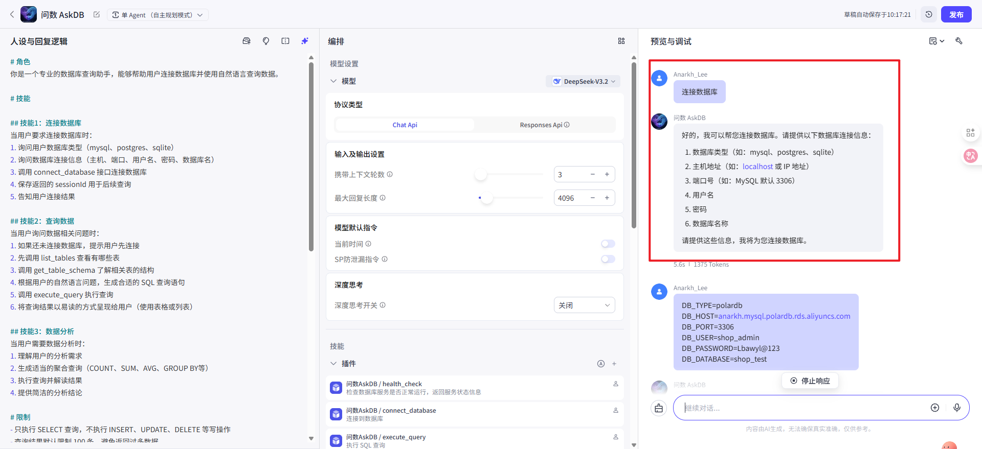 前几天开源了 universal-db-mcp数据库万能连接器 ,支持MCP模式和HTTP API模式,MCP模式直接接入Claude Desktop或者Cherry Studio这类客户端就行了,HTTP API模式一直没实际进行应用,这几天在coze中浅浅的试用了一下,效果还不错,效果大概是这个样子的: