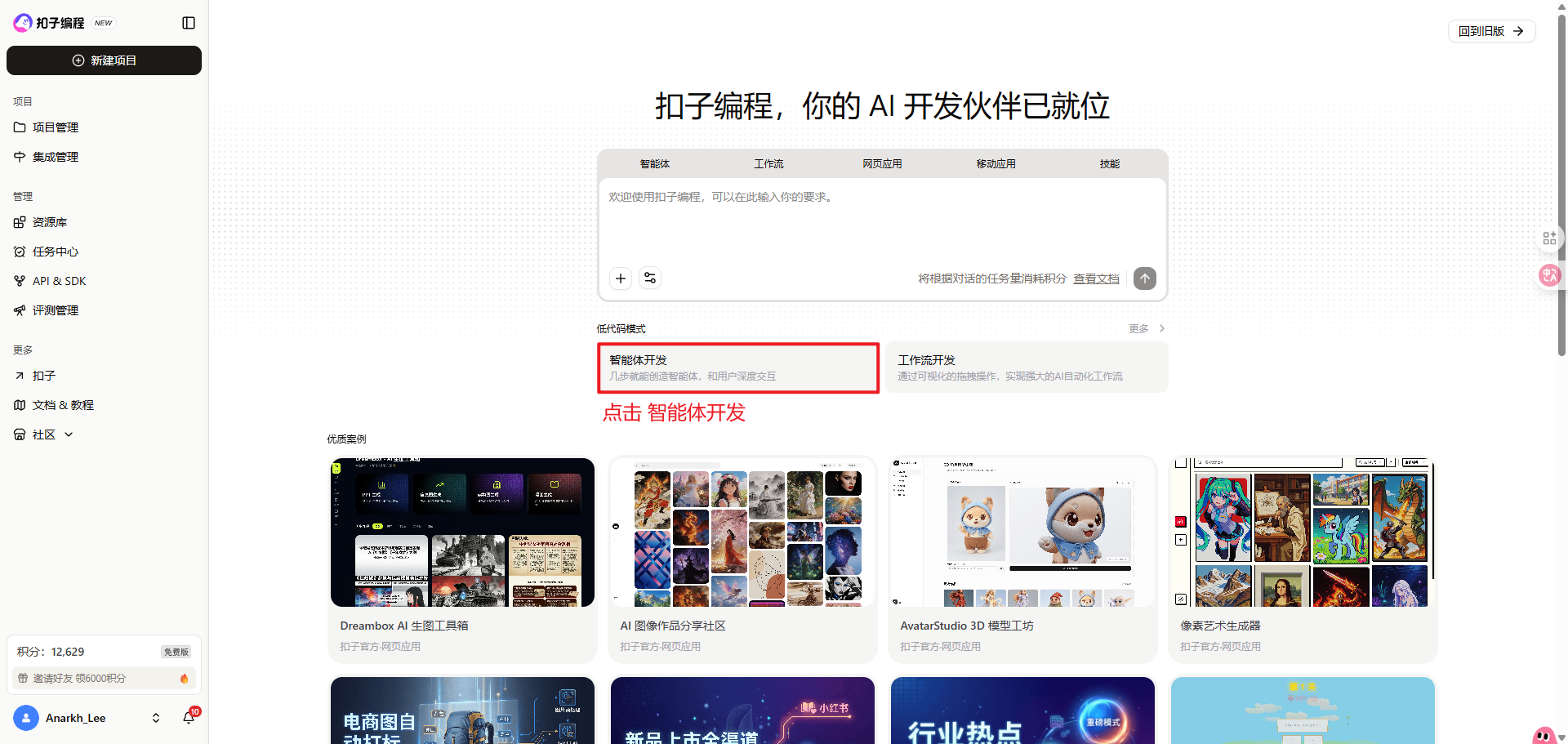 首先,进入 Coze 平台的扣子编程界面,选择 智能体开发。