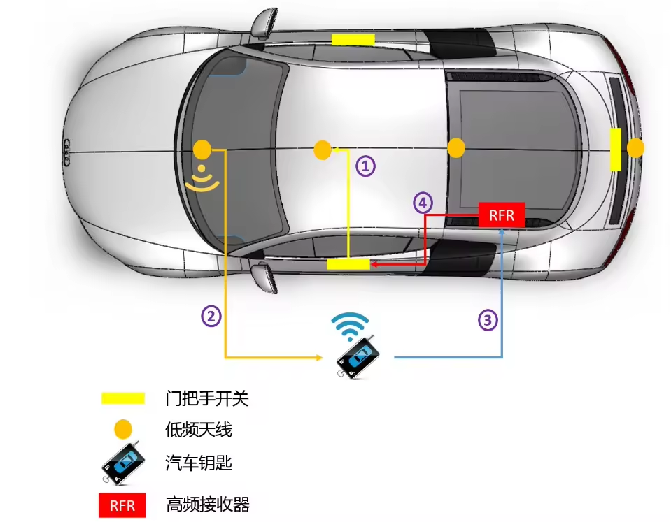 低频唤醒 (LF, 125kHz): 当你拉门把手时,车身天线发出低频信号,"唤醒"周围的钥匙。