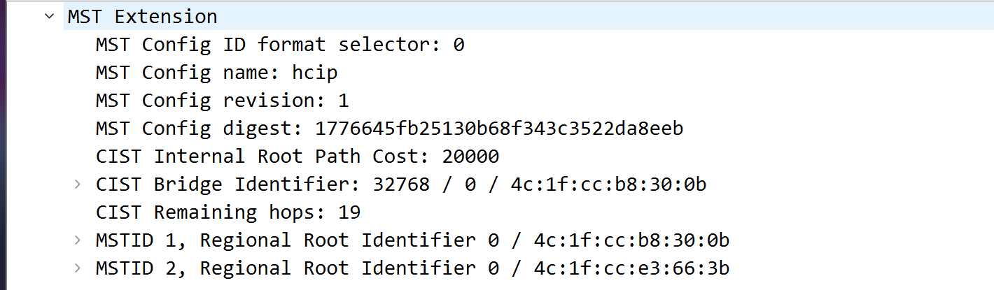 19→ MSTP 报文的剩余跳数(默认最大跳数是 20,这里表示还能转发 19 次)