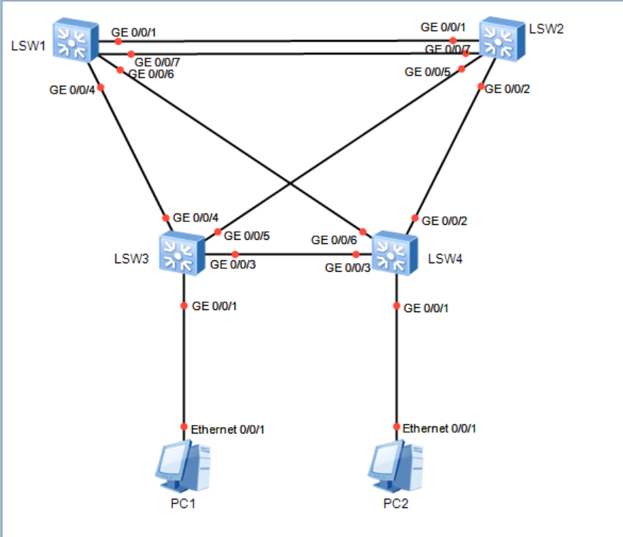 system-view \[Huawei\]undo info-center enable \[Huawei\]sysname LSW2 \[LSW2\]vlan batch 10 20 30 40 50 60 70 80 \[LSW2\]port-group 1 \[LSW2-port-group-1\]group-member g0/0/1 \[LSW2-port-group-1\]group-member g0/0/7 \[LSW2-port-group-1\]group-member g0/0/5 \[LSW2-port-group-1\]group-member g0/0/2 \[LSW2-port-group-1\]port link-type trunk \[LSW2-GigabitEthernet0/0/1\]port link-type trunk \[LSW2-GigabitEthernet0/0/7\]port link-type trunk \[LSW2-GigabitEthernet0/0/5\]port link-type trunk \[LSW2-GigabitEthernet0/0/2\]port link-type trunk \[LSW2-port-group-1\]port trunk allow-pass vlan all \[LSW2-GigabitEthernet0/0/1\]port trunk allow-pass vlan all \[LSW2-GigabitEthernet0/0/7\]port trunk allow-pass vlan all \[LSW2-GigabitEthernet0/0/5\]port trunk allow-pass vlan all \[LSW2-GigabitEthernet0/0/2\]port trunk allow-pass vlan all \[LSW2\]undo info-center enable \[LSW2\]stp enable \[LSW2\]stp mode mstp \[LSW2\]stp region-configuration \[LSW2-mst-region\]region-name hcip \[LSW2-mst-region\]revision-level 1 \[LSW2-mst-region\]instance 1 vlan 10 30 50 70 \[LSW2-mst-region\]instance 2 vlan 20 40 60 80 \[LSW2-mst-region\]active region-configuration \[LSW2-mst-region\]quit \[LSW2\]stp instance 1 root secondary //备网桥 \[LSW2\]stp instance 2 root primary //根网桥 \[LSW2\]display stp instance 1 brief \[LSW2\]display stp instance 2 brief **LSW3:** \ system-view \[Huawei\]undo info-center enable \[Huawei\]sysname LSW3 \[LSW3\]vlan batch 10 20 30 40 50 60 70 80 \[LSW3\]port-group 1 \[LSW3-port-group-1\]group-member g0/0/4 \[LSW3-port-group-1\]group-member g0/0/3 \[LSW3-port-group-1\]group-member g0/0/5 \[LSW3-port-group-1\]port link-type trunk \[LSW3-GigabitEthernet0/0/4\]port link-type trunk \[LSW3-GigabitEthernet0/0/3\]port link-type trunk \[LSW3-GigabitEthernet0/0/5\]port link-type trunk \[LSW3-port-group-1\]port trunk allow-pass vlan all \[LSW3-GigabitEthernet0/0/4\]port trunk allow-pass vlan all \[LSW3-GigabitEthernet0/0/3\]port trunk allow-pass vlan all \[LSW3-GigabitEthernet0/0/5\]port trunk allow-pass vlan all \[LSW3-port-group-1\]quit \[LSW3\]undo info-center enable \[LSW3\]stp enable \[LSW3\]stp mode mstp \[LSW3\]stp region-configuration \[LSW3-mst-region\]region-name hcip \[LSW3-mst-region\]revision-level 1 \[LSW3-mst-region\]instance 1 vlan 10 30 50 70 \[LSW3-mst-region\]instance 2 vlan 20 40 60 80 \[LSW3-mst-region\]active region-configuration \[LSW3-mst-region\]quit \[LSW3\]interface g0/0/1 \[LSW3-GigabitEthernet0/0/1\]stp edged-port enable //边缘端口 \[LSW3-GigabitEthernet0/0/1\]quit \[LSW3\]quit \ display stp instance 1 brief \ display stp instance 2 brief **LSW4:** \ system-view \[Huawei\]undo info-center enable \[Huawei\]sysname LSW4 \[LSW4\]port-group 1 \[LSW4-port-group-1\]group-member g0/0/3 \[LSW4-port-group-1\]group-member g0/0/6 \[LSW4-port-group-1\]group-member g0/0/2 \[LSW4-port-group-1\]port link-type trunk \[LSW4-GigabitEthernet0/0/3\]port link-type trunk \[LSW4-GigabitEthernet0/0/6\]port link-type trunk \[LSW4-GigabitEthernet0/0/2\]port link-type trunk \[LSW4-port-group-1\]port trunk allow-pass vlan all \[LSW4-GigabitEthernet0/0/3\]port trunk allow-pass vlan all \[LSW4-GigabitEthernet0/0/6\]port trunk allow-pass vlan all \[LSW4-GigabitEthernet0/0/2\]port trunk allow-pass vlan all \[LSW4-port-group-1\]quit \[LSW4\]undo info-center enable \[LSW4\]stp enable \[LSW4\]stp mode mstp \[LSW4\]stp region-configuration \[LSW4-mst-region\]region-name hcip \[LSW4-mst-region\]revision-level 1 \[LSW4-mst-region\]instance 1 vlan 10 30 50 70 \[LSW4-mst-region\]instance 2 vlan 20 40 60 80 \[LSW4-mst-region\]active region-configuration \[LSW4-mst-region\]quit \[LSW4\]interface g0/0/1 \[LSW4-GigabitEthernet0/0/1\]stp edged-port enable \[LSW4-GigabitEthernet0/0/1\]quit \[LSW4\]quit \ display stp instance 1 brief \[LSW4\]vlan batch 10 20 30 40 50 60 70 80 \[LSW4\]quit \ display stp instance 1 brief \ display stp instance 2 brief