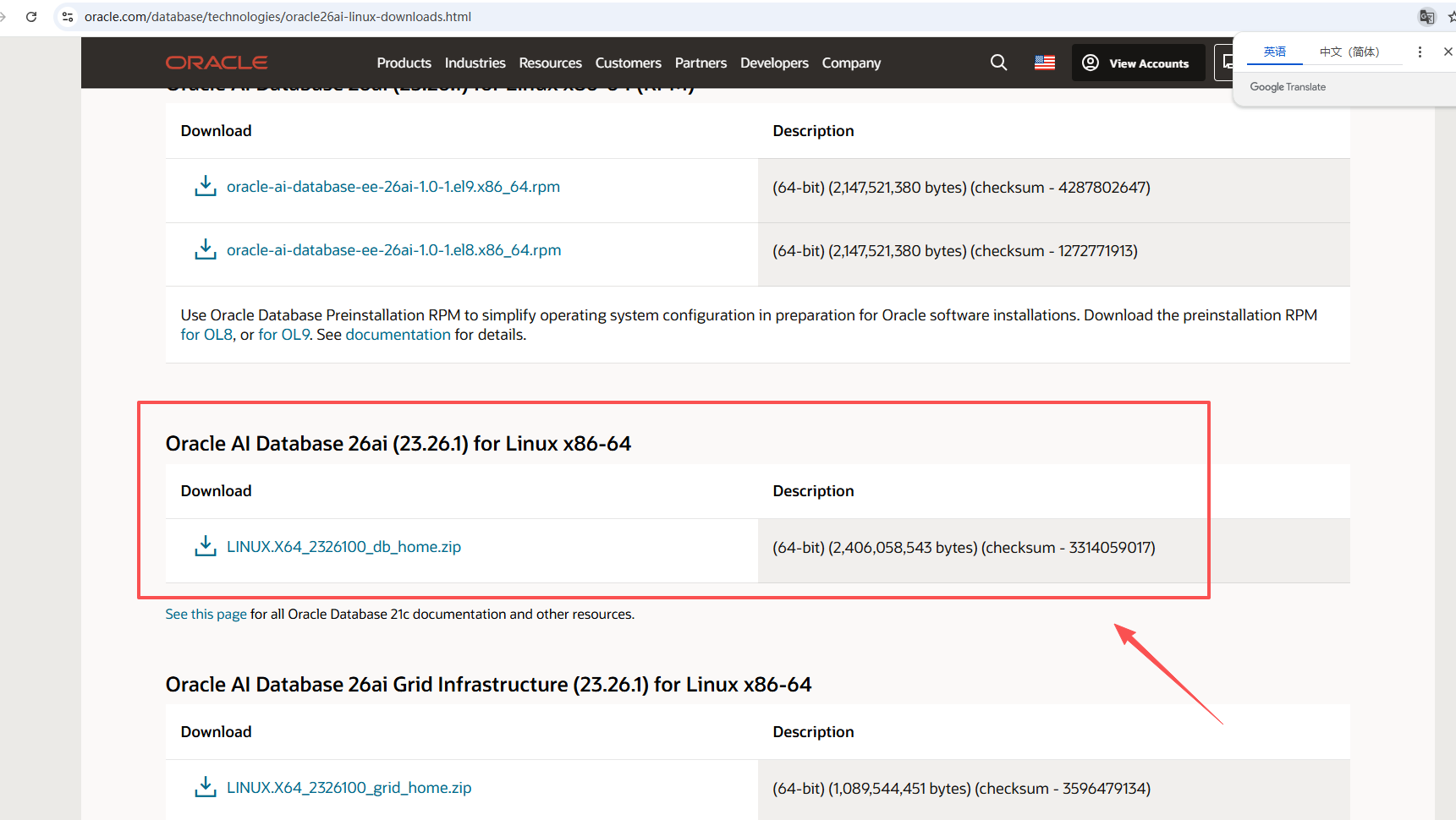 下载地址:https://www.oracle.com/database/technologies/oracle26ai-linux-downloads.html