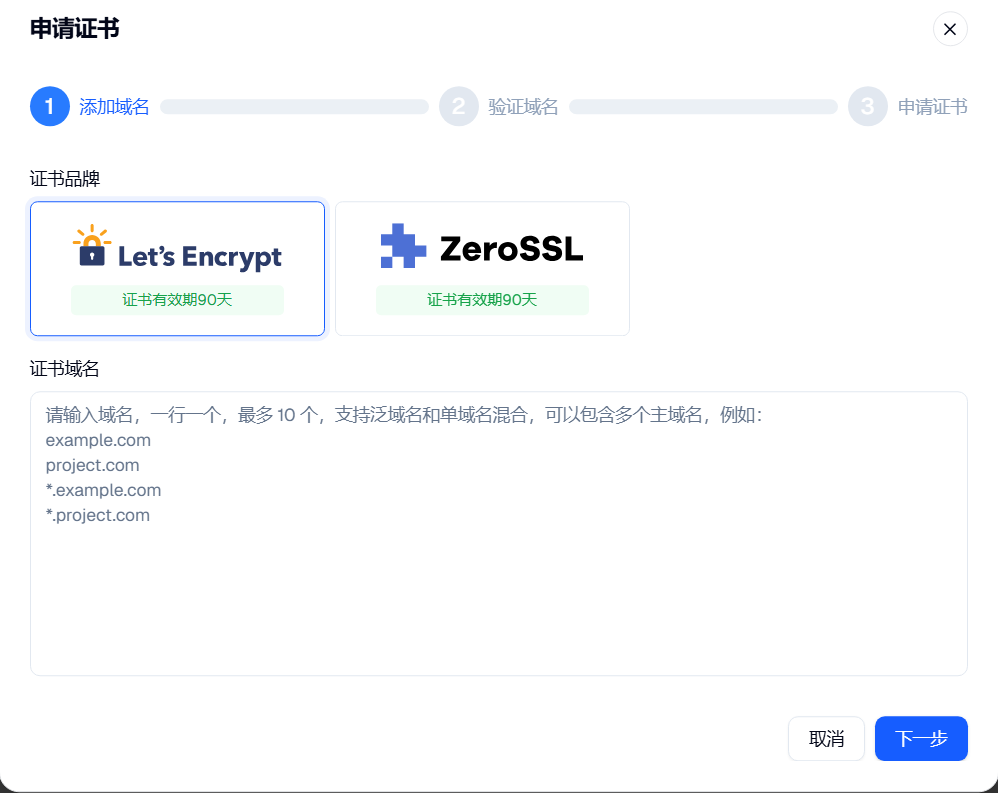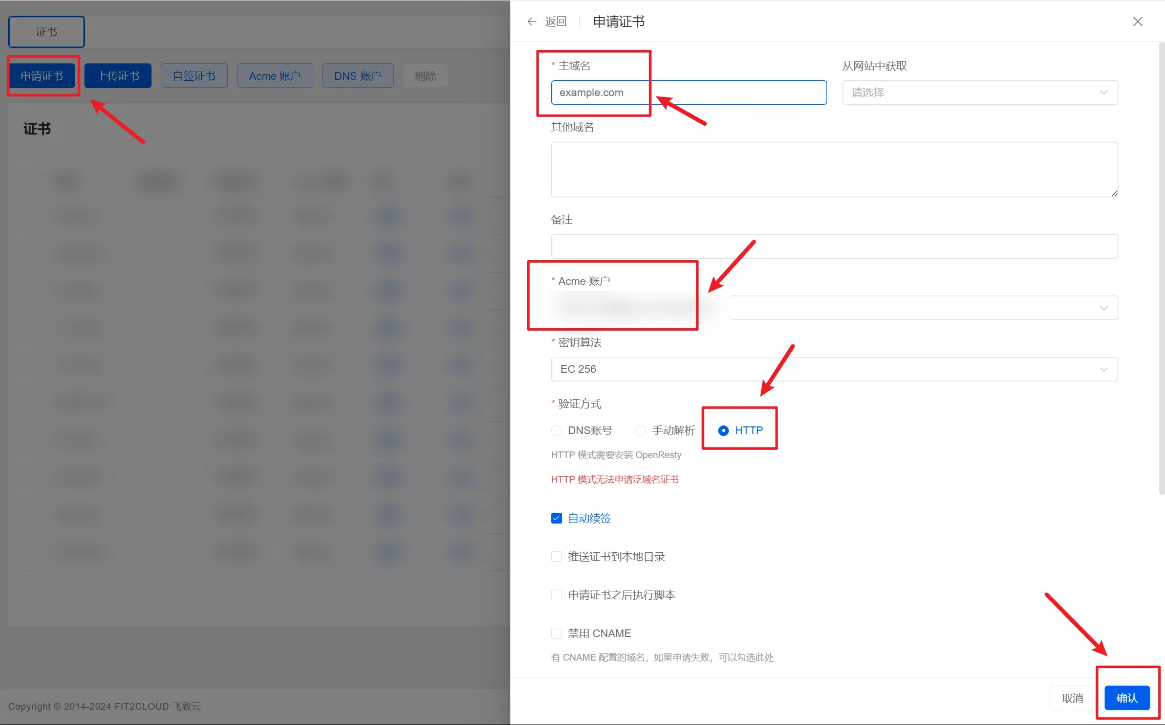 需要注意的是,使用 HTTP 验证方式时,你不能申请泛域名证书。以下是 HTTP 验证的具体步骤: