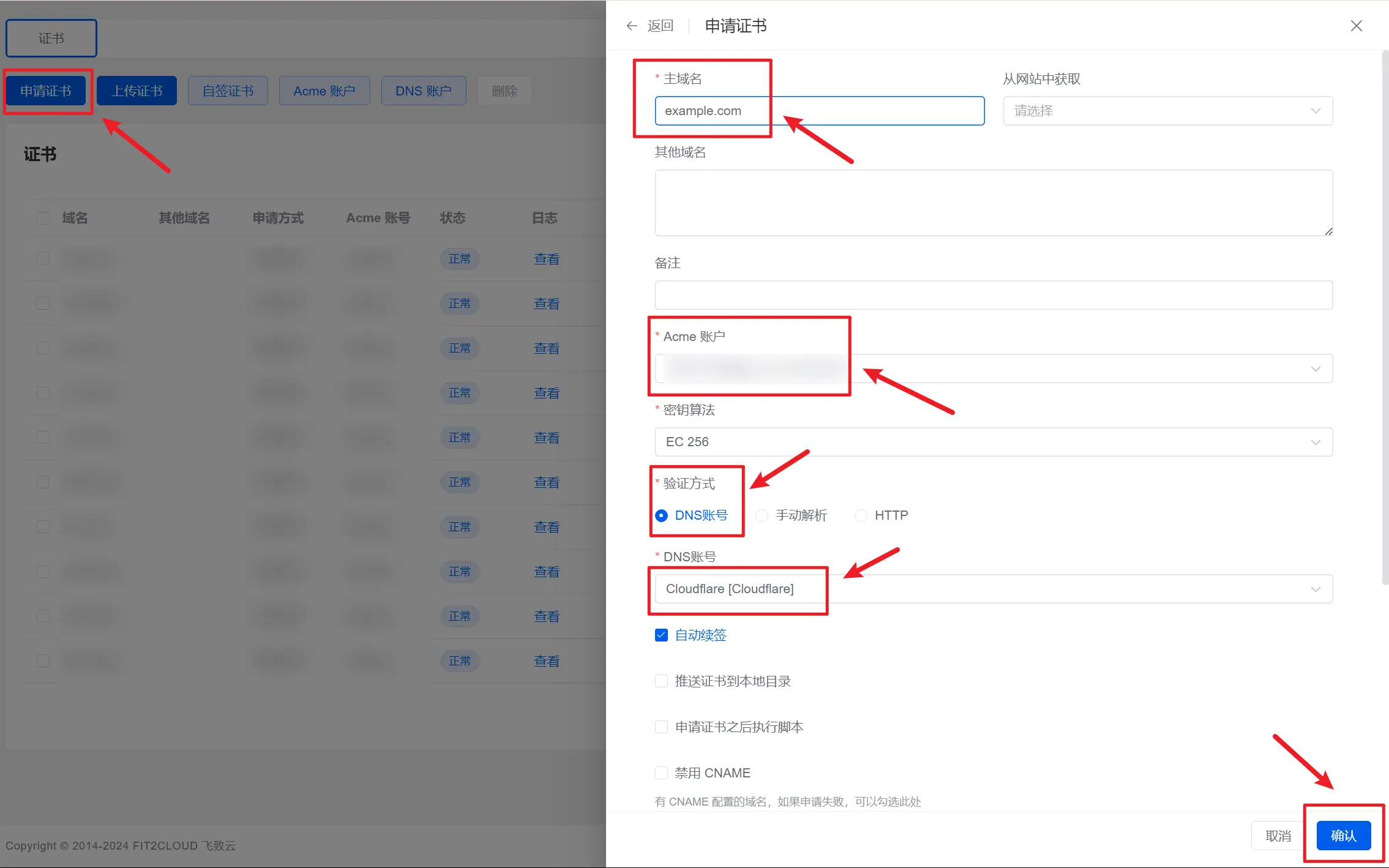 选择你创建的 DNS 账户(比如 CloudFlare),然后点击确认申请证书。