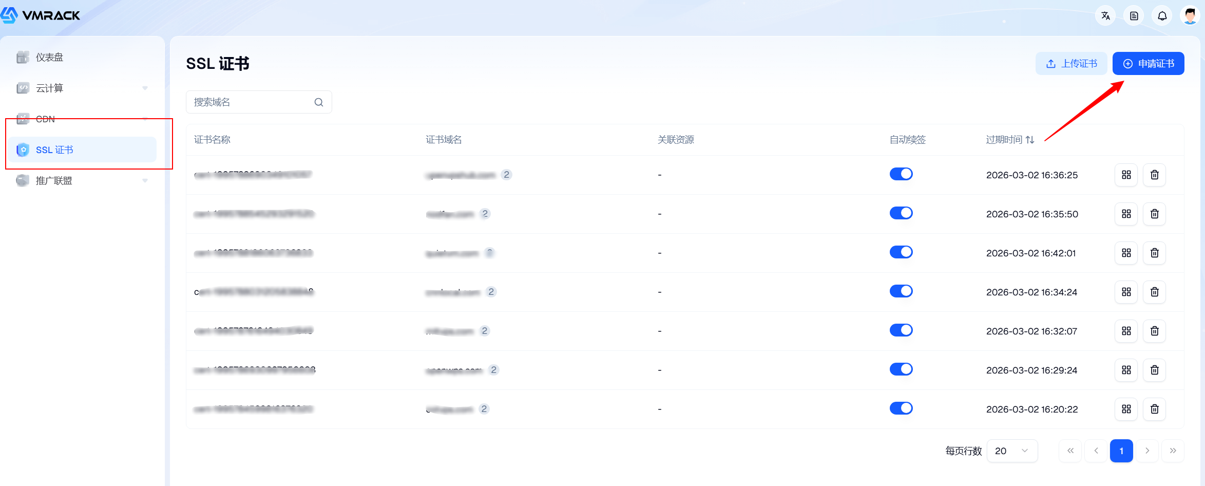 点击左边"SSL 证书"并再次点击右上角"申请证书"。